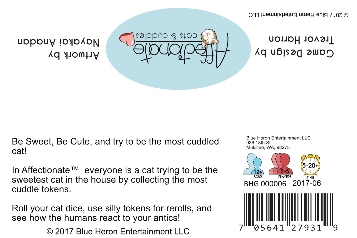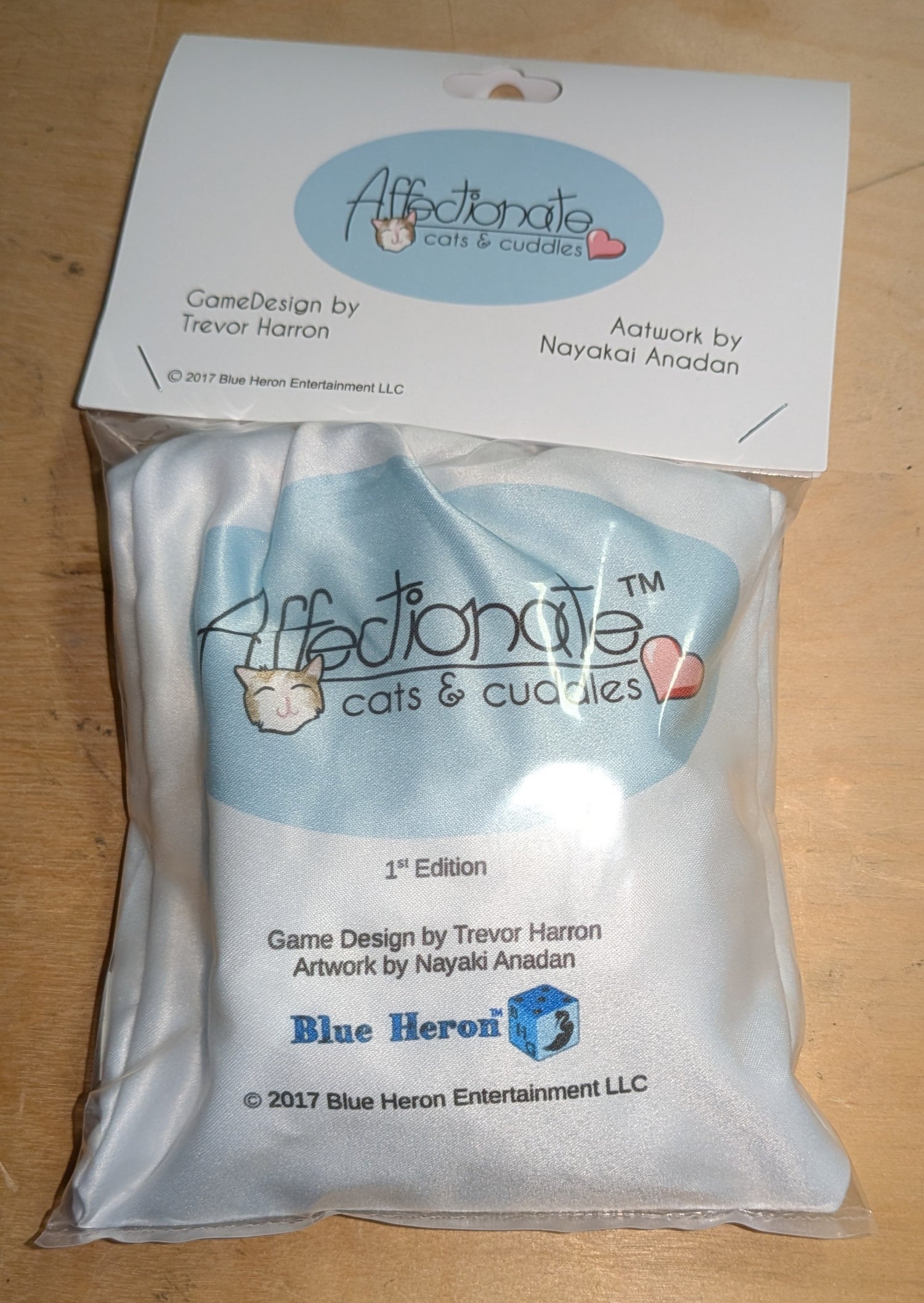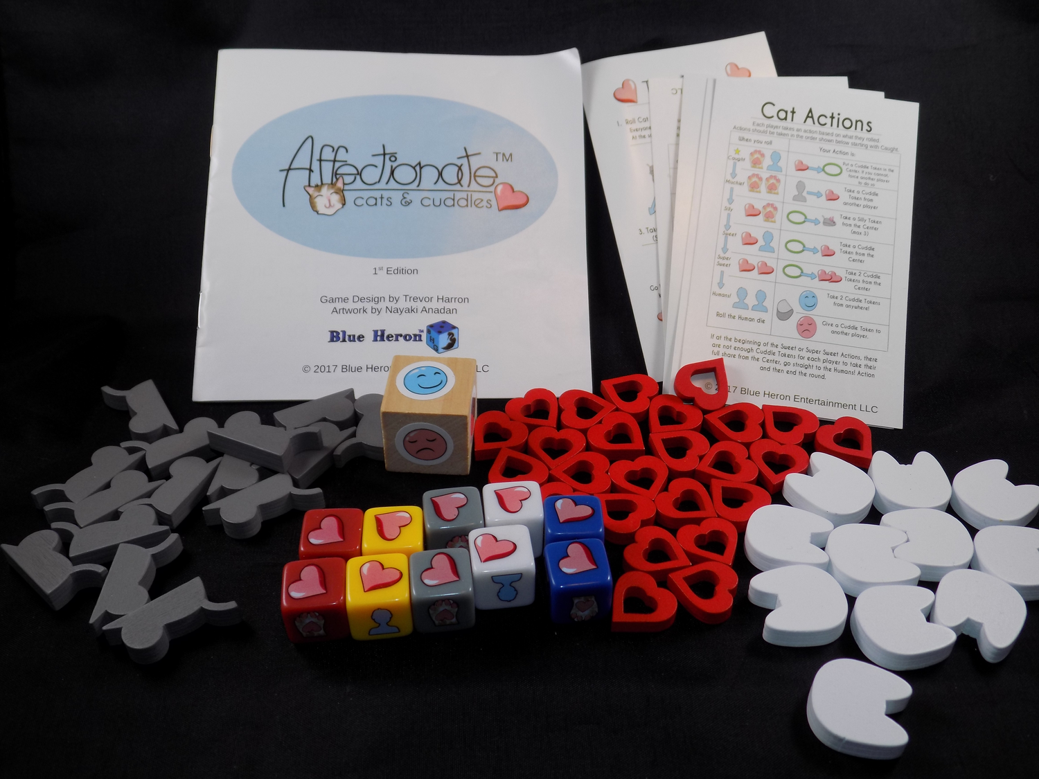 In Affectionate™ everyone rolls their cat dice to see what action they take and how the humans react! Being sweet gains you cuddle tokens, if you're caught you lose your hard earned cuddles or can force another cat to lose them, you can be silly and gain opportunities to change your luck, be mischievous and steal cuddles for yourself, or even see what the human does! The game ends when all of the cuddle tokens are gone from the middle!