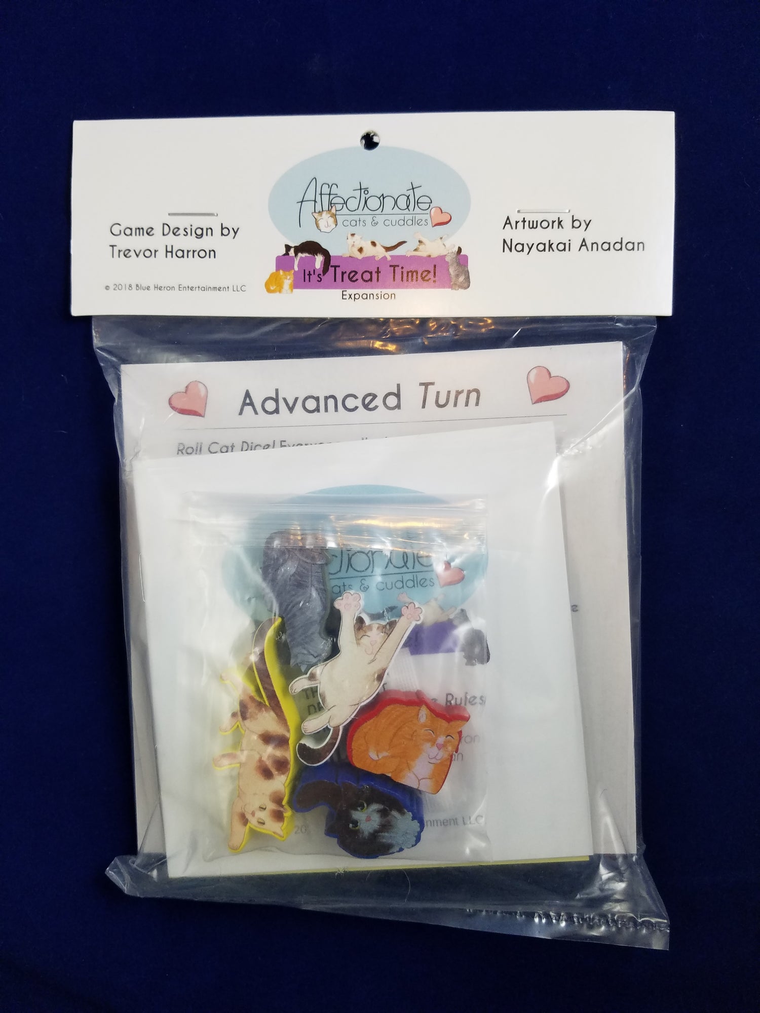 Expansion to Affectionate Cats and Cuddles, discover new ways to play with Treat Time! Play as 1 of 5 cats and unlock new mechanics and ways to gain the most cuddles. Draft dice, choose your action and be sweet in this expansion that adds new layers of strategy to Affectionate.