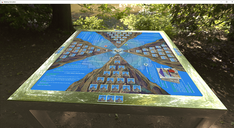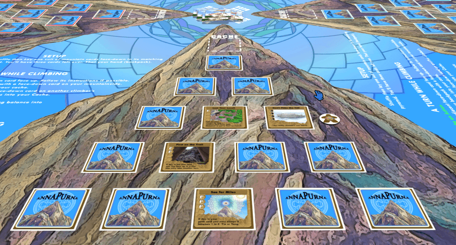 Once you reach the mountain's peak, you add your cache to your hand, then you can spend your turns doing nothing, dropping cards from your cache face up on the mountain to better balance your yin and yang, and throwing cache cards onto another player's mountain, who then flips up one of your remaining face-down cards.