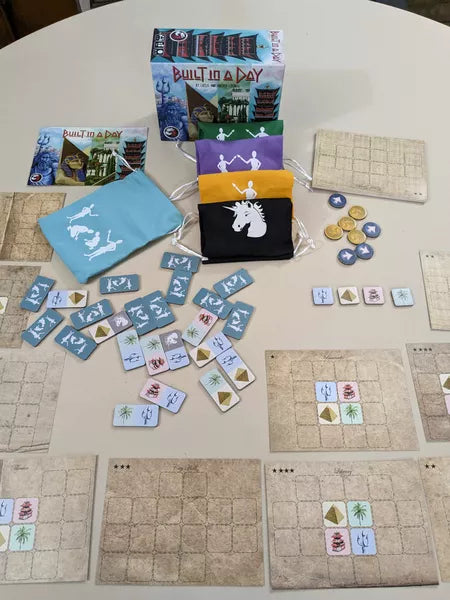 Built in a day is a competitive tile laying game for 1-4 players. You can play as Greece, Egypt, Babylon, or China as you compete with the other players to build one of ten floor plans. The end of the game is triggered when one player completes their building but the player with the most uniform building will win.