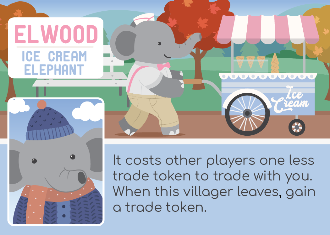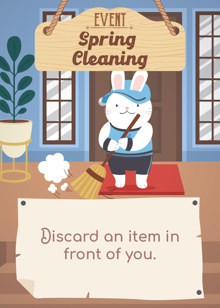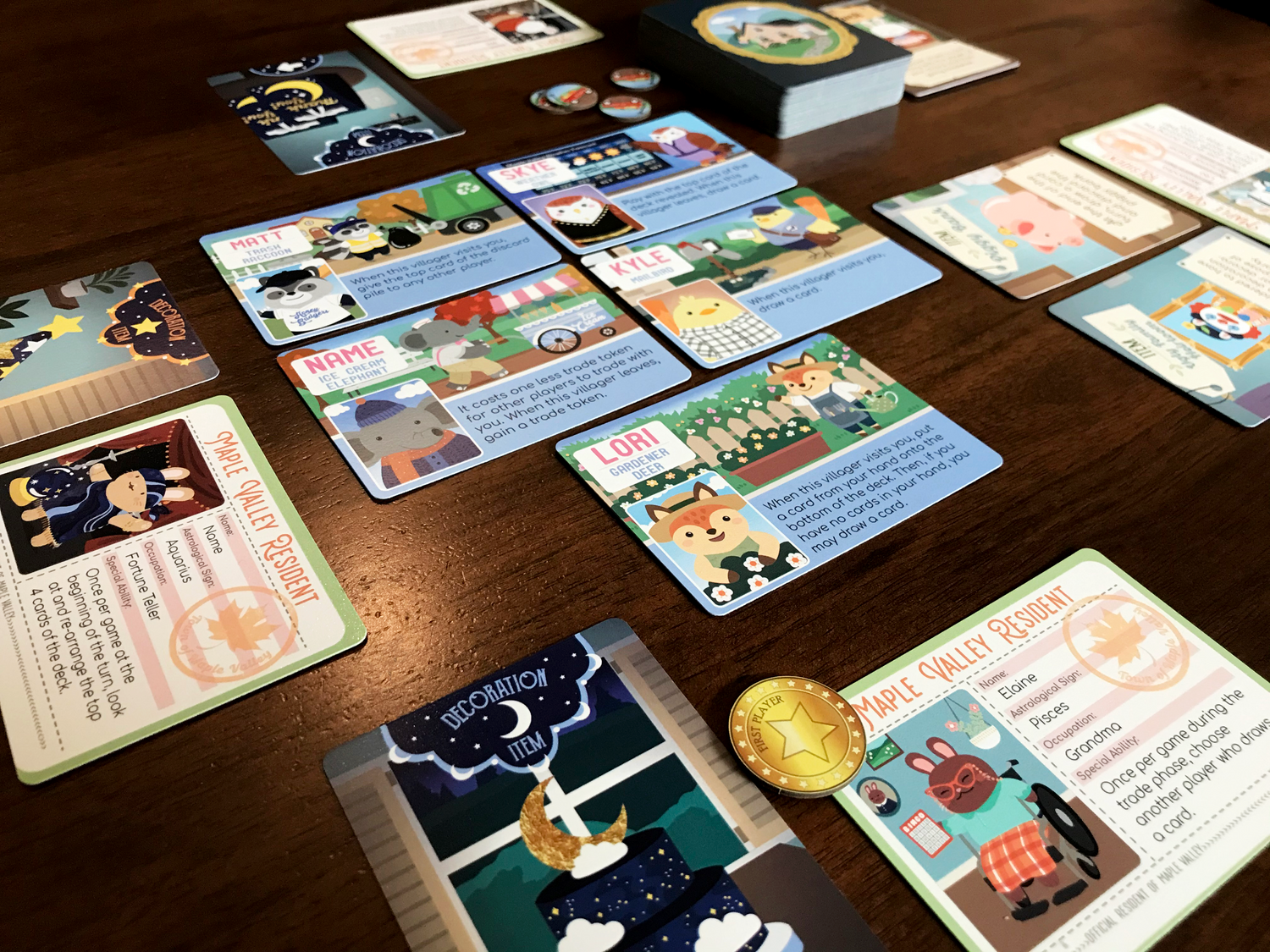 At the beginning of each turn, players will draw 2 cards (3 on the first turn) and a trade token. Then, each player tidies a card by discarding it, or giving it to another player at the cost of a trade token. Each player then drafts a villager to help them decorate the for the party for that turn (villagers may help get you more cards, trade tokens, or other benefits). After each player has a villager visit them, it's time to play cards. Item cards are played in front of players and events have have a one time effect and are then discarded. Each player plays cards one at a time until no one has any cards left in their hand, which means you'll have to play your cards even if they aren't so great (like an ugly family heirloom!) After all cards have been played, two players may trade items in front of them if each of them spends a trade token to do so. Two types of items, moon and star decorations, are very important items because they are the victory condition, so be careful how you trade them.