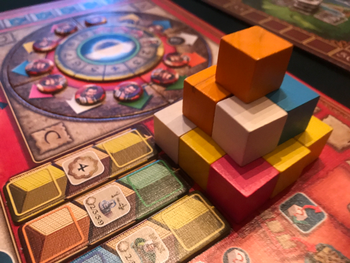 Burano is played over four seasons, 14 rounds altogether. Through the novel "cube pyramid-driven" mechanism, players take turns paying coins to operate their cube pyramid during each round. The operation of the color-coded cubes would trigger certain actions, such as fishing, lace making, and house roofing, which will earn players victory points (VP). At the end of the game, whoever has earned the most VP wins.