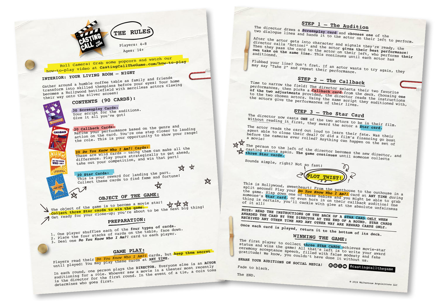 Dying to be famous? Kill for a good part? This Horror Movie expansion pack for Casting Call: The Game offers macabre movie scripts, creepy callbacks, and sinister star cards. Rest in peace because you’ll soon hit the big time!