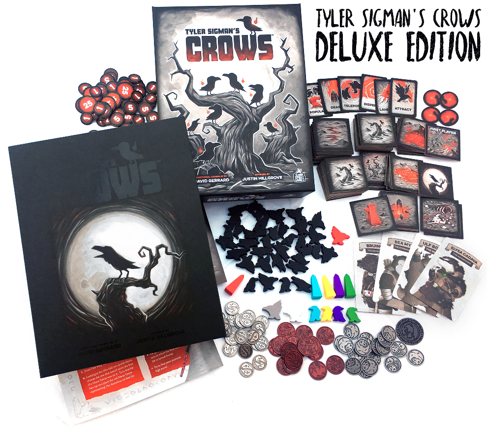 Note on Deluxe Edition: Game comes with metal coins for score tracking, a limited edition box sleeve, a sheet with new expansion and solo rules, and several new crow meeples for the expansions.