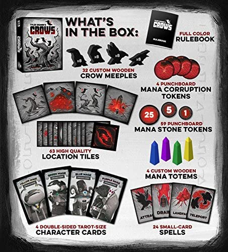 Tyler Sigman's Crows is a competitive tile placement game where every player takes on the role of an Outcast Mage in the world of Tessandor. A once-in-a-lifetime event is causing the crows of the Obsidian Wastes to give off mana that can be collected in magical stones. Players score points by enticing crows to flock to their totem (their shiny object). This can potentially create murders of crows, which then disperse throughout the ever changing map keeping the strategic gameplay tense and diverse.