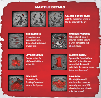 Every game of Tyler Sigman’s Crows is different as the map is built uniquely because of the variety of map tiles. Each tile has different rules with some adding crows, or awarding spells, or changing how the Crows flock at the end of each turn. These map tiles along with the Spells and player choices ensures that every game of Tyler Sigman’s Crows plays entirely different from each other game.