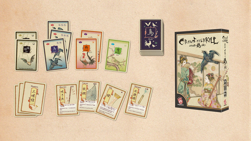The game consists of two decks of cards — birds and shamisen — along with a time board. Cards are drawn from both decks. Birds are placed on the table in front of the current player, while shamisen cards go into their hand. Shamisen cards are then played to eliminate birds. A check is made against the time board to see whether the remaining birds cry and the current player is eliminated.