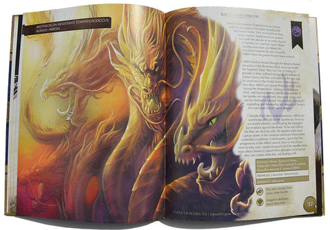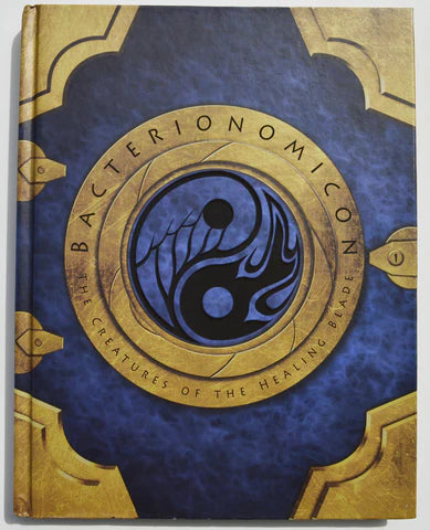 The Bacterionomicon is a compendium of infectious bacteria and antibiotics presented in the style of an RPG bestiary book, in order to use imagination, metaphor, and stories to aid learning and promote awareness about antibiotic misuse. The book contains entries for 46 "Lords of Pestilence" from Acinetobacter baumannii to Yersinia pestis, and 30 "Apothecary Warriors" from Amoxicillin/Clavulanate to Vancomycin. Each entry includes an elaborate high fantasy illustration, descriptions of tribal groupings, fighting styles, and nemeses, and an article about its role in the ongoing battles across the Soman countryside.