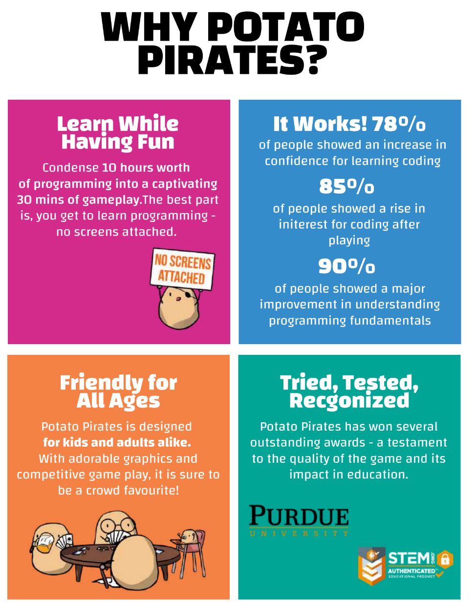 Potato Pirates: Enter the Spudnet is inspired by how the Internet works, the possible dangers online and how one can stay safe in the cyber space. We mashed potatoes and networking concepts into this cyber-fueled board game for players to learn about networking and cybersecurity concepts - all without computers!
