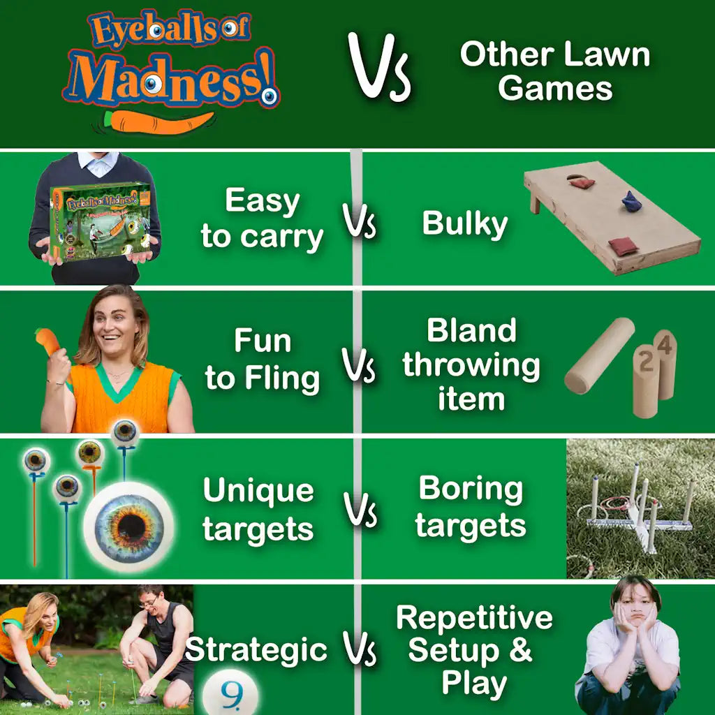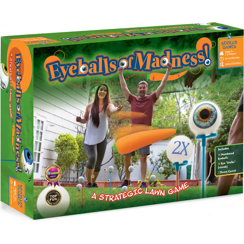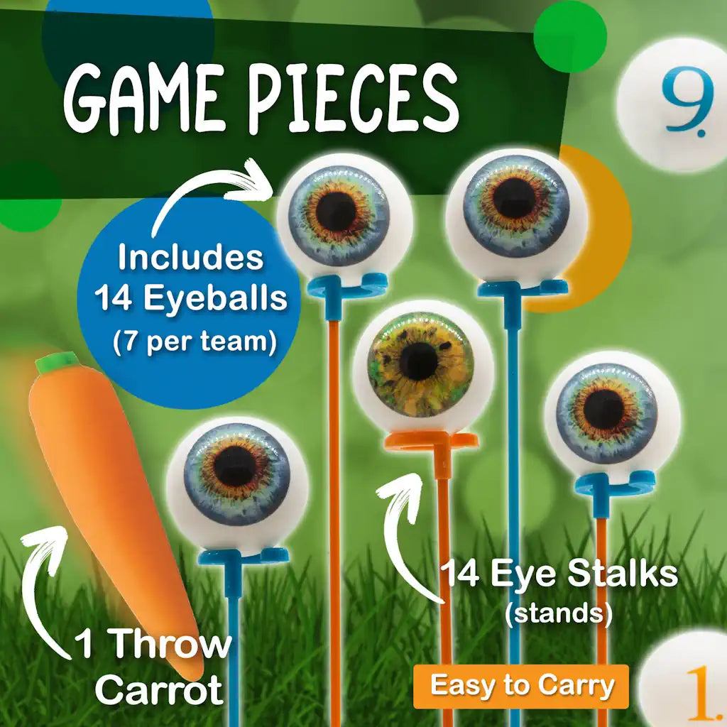 Arrange your team’s targets (“eyeballs”) to mislead and challenge your opponents. Then toss a “carrot” at their arrangement, trying to hit the eyeballs that will maximum your score. Part wacky lawn game, part strategic competition, it’s a great alternative to other ‘stand and toss’ yard games. Includes a simplified version for kids, fourteen eyeballs, fourteen stands and one stretchy carrot.