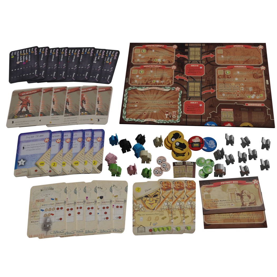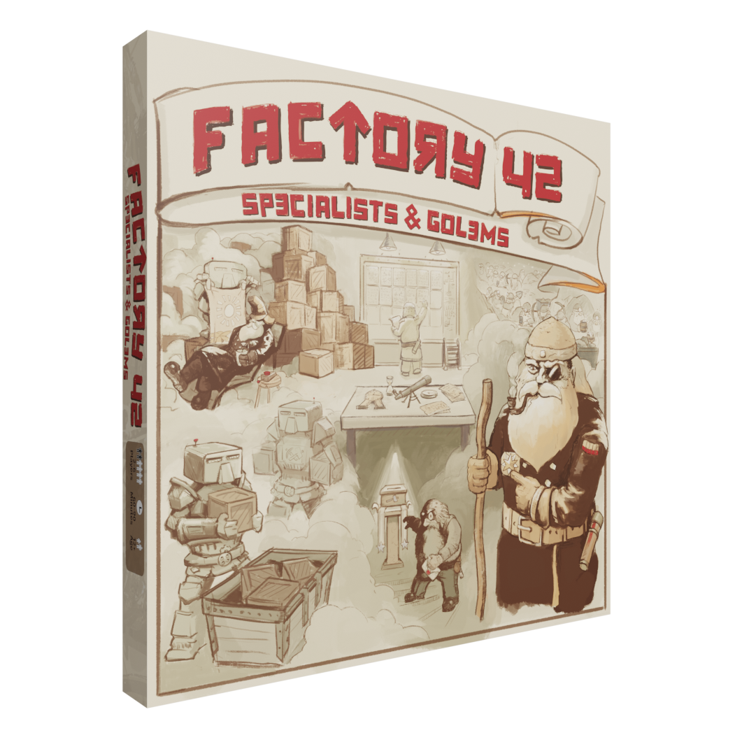 The “Specialists and Golems” Expansion introduces six new elements to Factory 42: Specialists and Golem (Cargador) meeples, the Patriot Box and Calendar Clerk action slots, Steam tanks and adds a sixth player.
