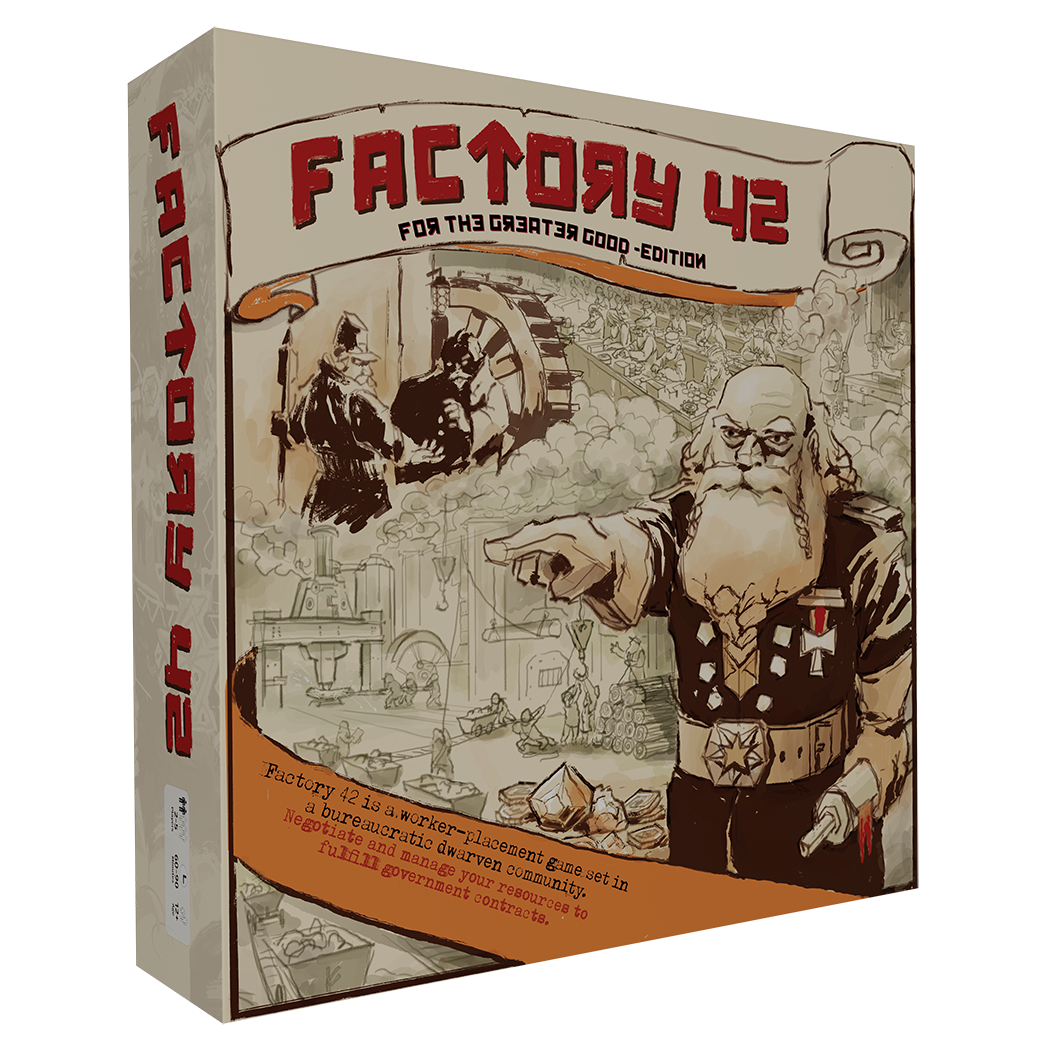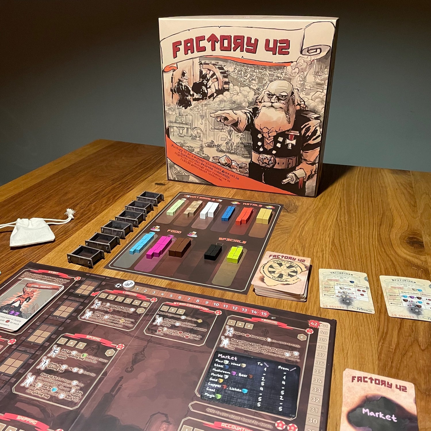 Factory 42 tells the story of the workweek of a Marxist dwarven society in a industrial steampunk setting. Players take the roles of factory Overseers striving to manage the most efficient workforce. It combines worker placement and a cube tower to create a resource management puzzle with a large amount of player interaction.