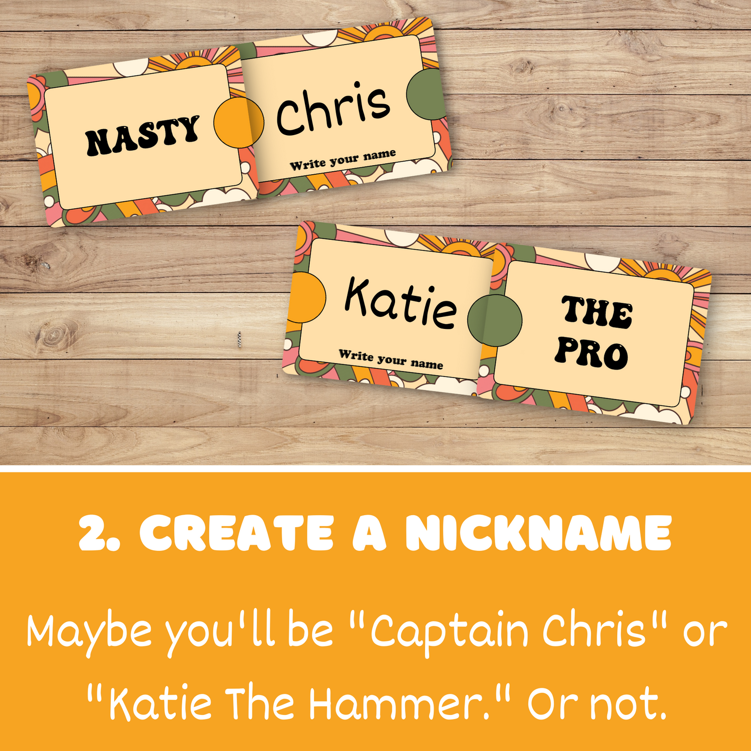 Give yourself a quirky NICKNAME like "Katie The Hammer" or "Captain Chris" to kick off each round in a twisted journey of self-discovery.