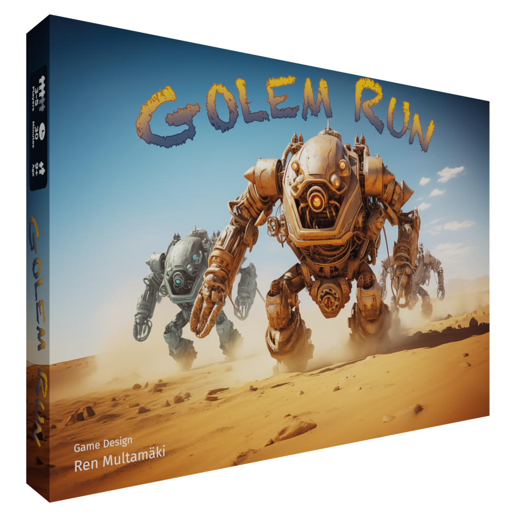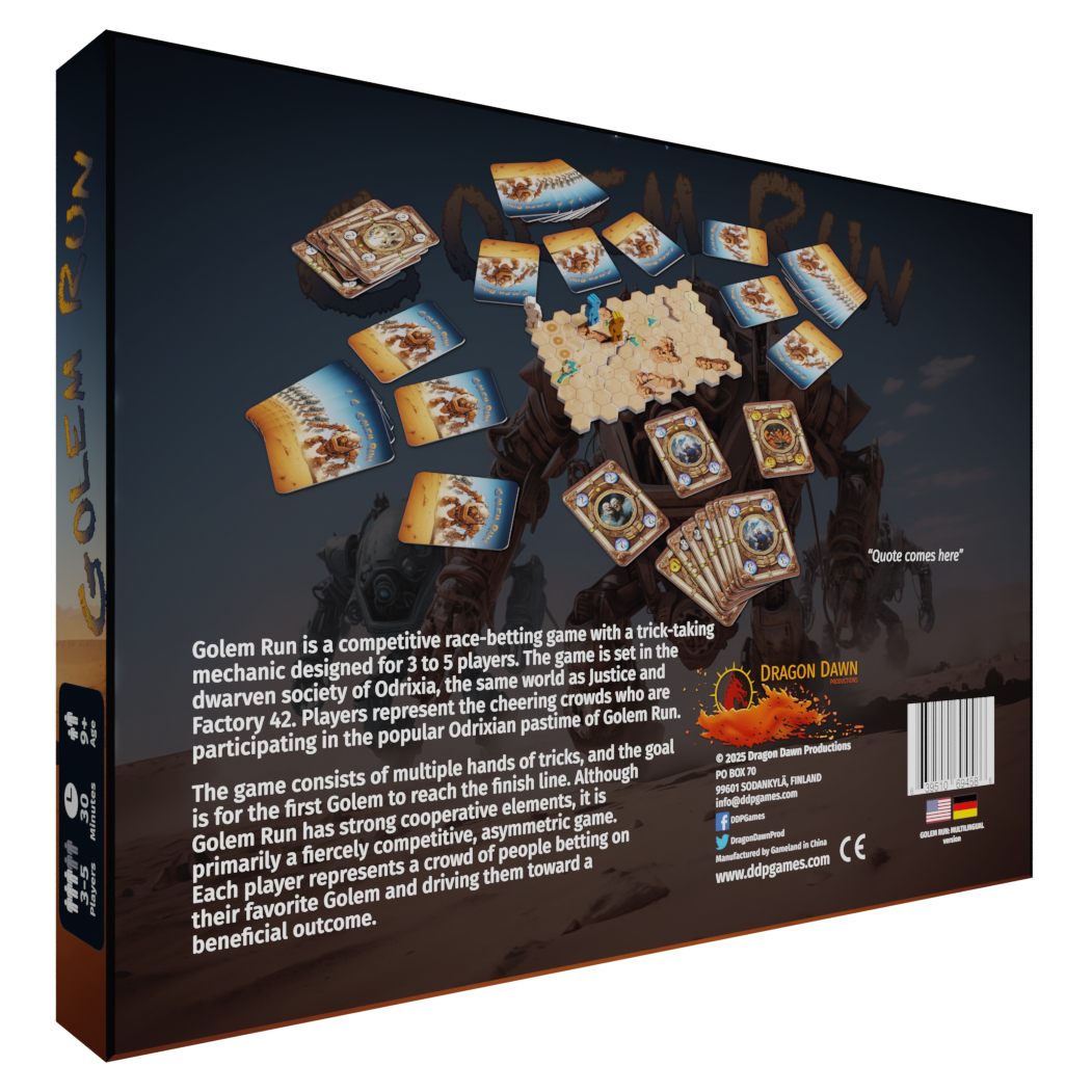 Golem Run is a competitive race-betting game with a trick-taking mechanic designed for 3 to 5 players. The game is set in the dwarven society of Odrixia, the same world as Justice and Factory 42. Players represent the cheering crowds who are participating in the popular Odrixian pastime of Golem Run.