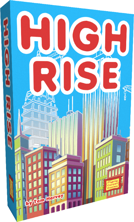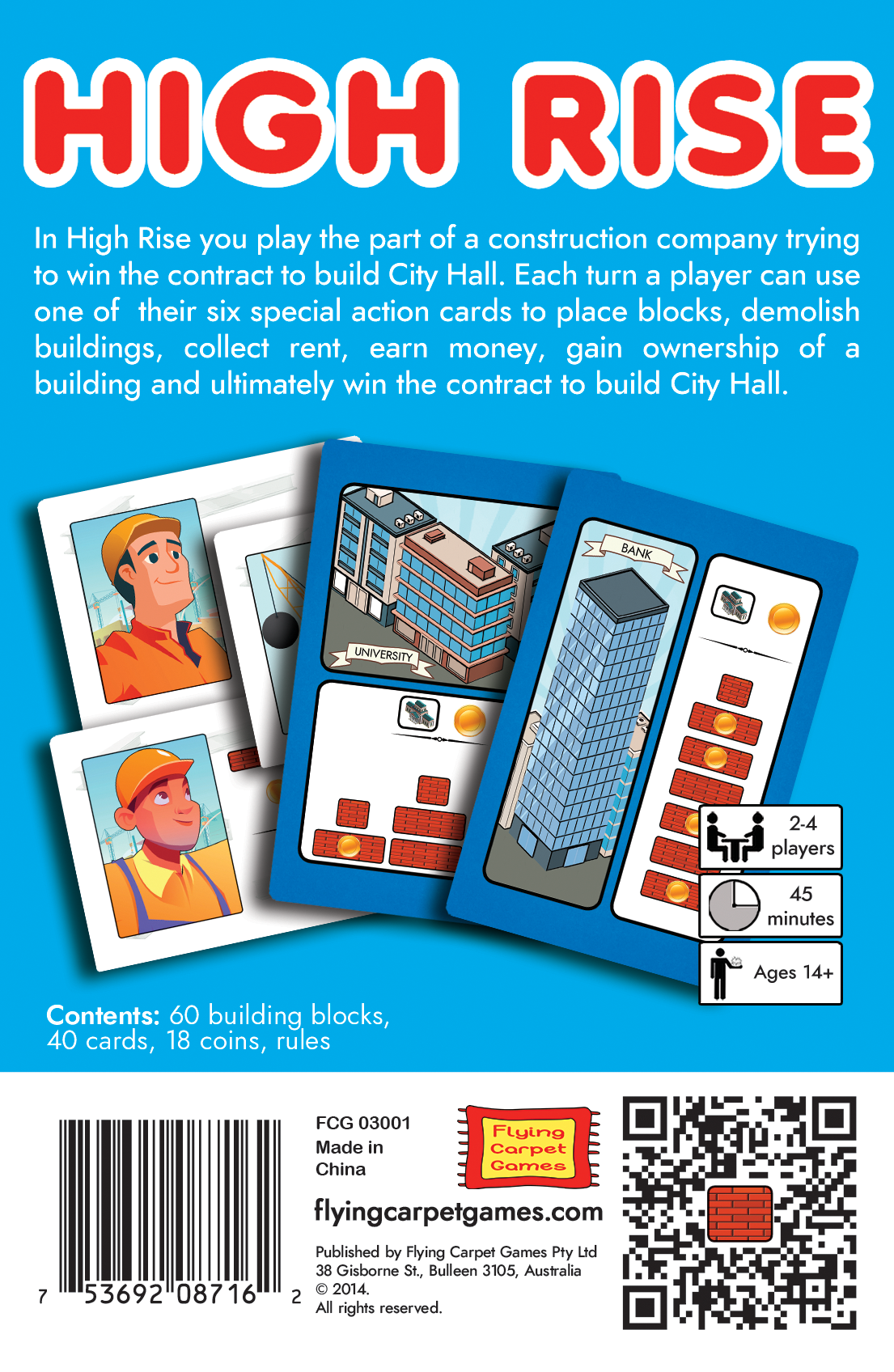 In High Rise you play the part of a construction company trying to win the contract to build City Hall. Each turn a player can use one of their six special action cards to place blocks, demolish buildings, collect rent, earn money, gain ownership of a building and ultimately win the contract to build City Hall.
