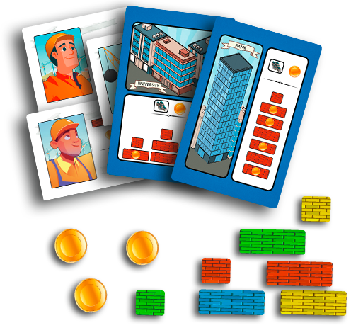 Play the part of a construction company trying to win the contract to build City Hall. Each turn a player can use one of their six special action cards to place blocks, demolish buildings, collect rent, earn money, and gain ownership of a building.