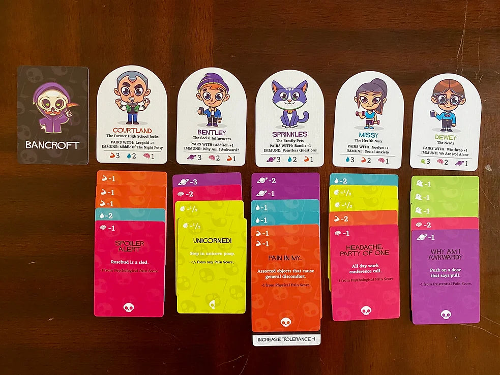 Using 18 new Mythical Pain cards you can inflict 1/2 pain to ANY category! Also included: 15 more Pain cards, 2 new Death Students, 2 new Test Subjects and 11 new Cheat Cards! Plus, you can now add a 6th player.