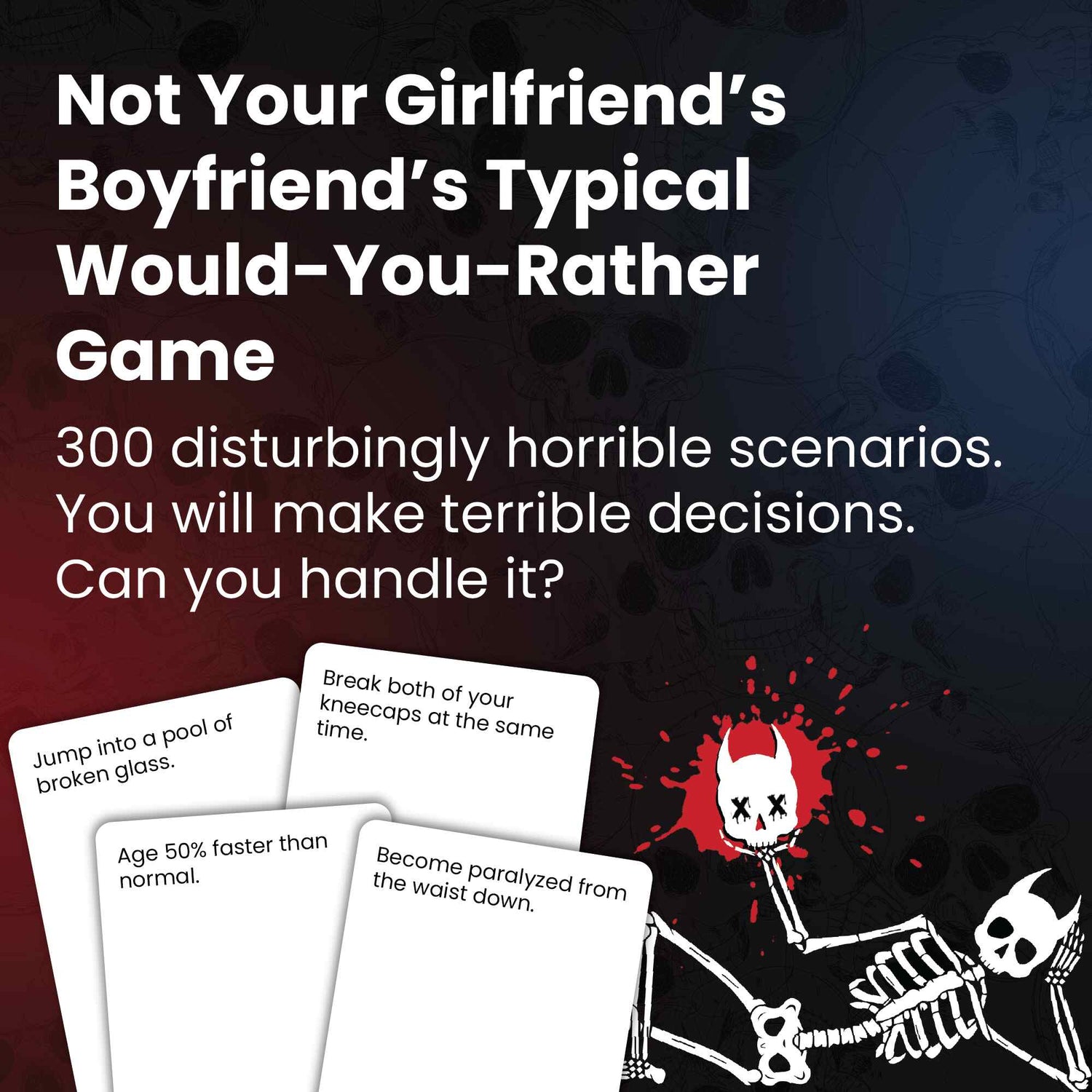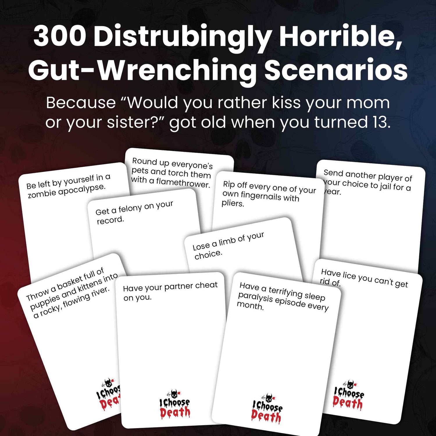 I Choose Death is not another would you rather game. Be forced to pick between 2 disturbingly horrible scenarios as you find out how desperate you'd really get when faced with awful situations.