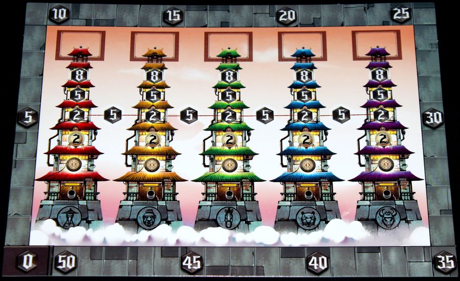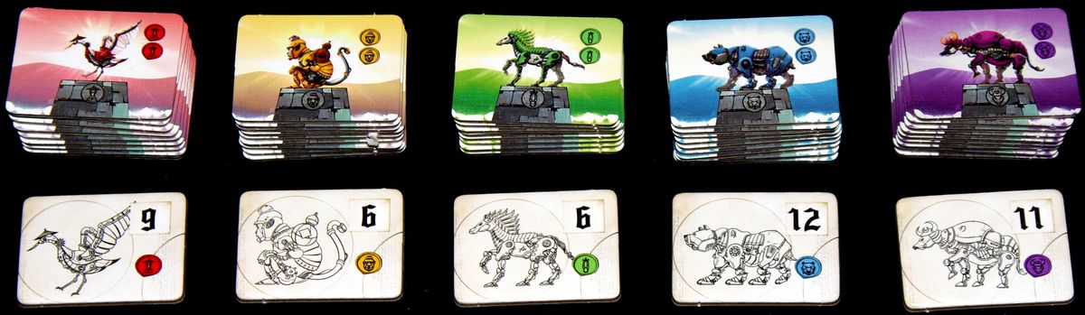 Players must acquire parts to build mechanical beasts, so they can advance their place on the Five Pagodas, receive new blueprints or bonus cards. When the Parts supplies run out, the the current Period ends and score is calculated. There are two Periods in the game, at the end of the game the player with the most Honor Points (VP) wins.