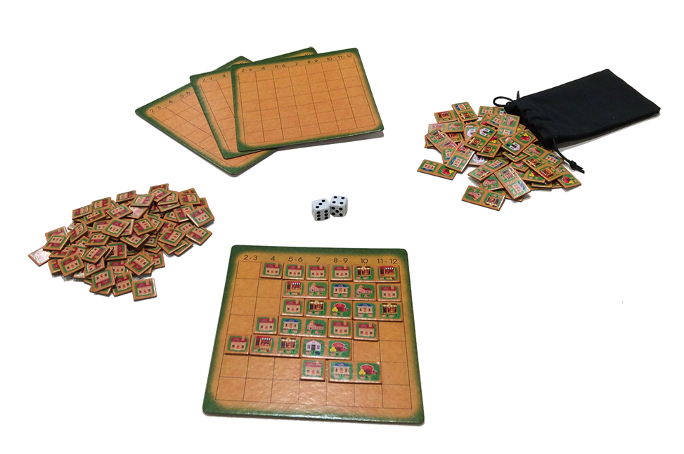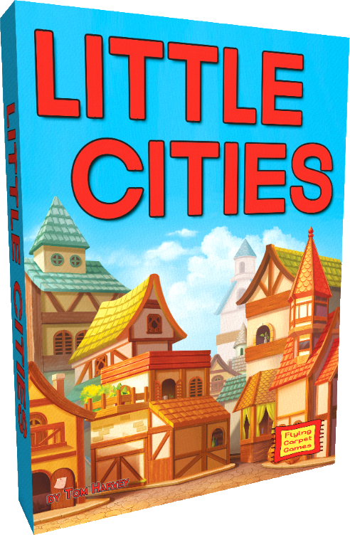 Little Cities is a light strategy game in which players add settlers to their city in an attempt to attract villagers to live there. Players simultaneously draw settler tiles and place them in their city, choosing a column number that will activate their ability. Two dice are then rolled and all activated settlers attract villagers, which players add to their city. The first player to fill their city is the winner!