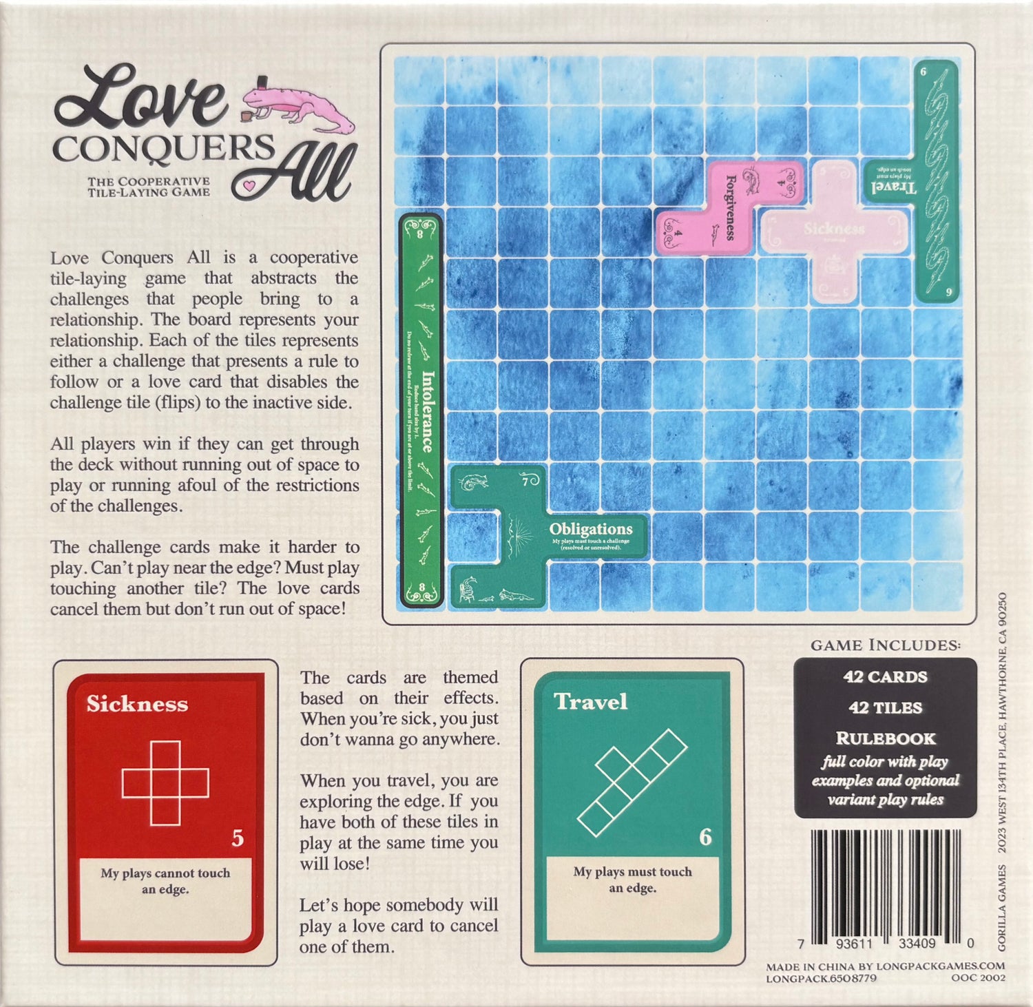 This cooperative tile-laying game abstracts the challenges of a relationship. Players win collectively if they can get through the challenge deck without running out of legal plays.