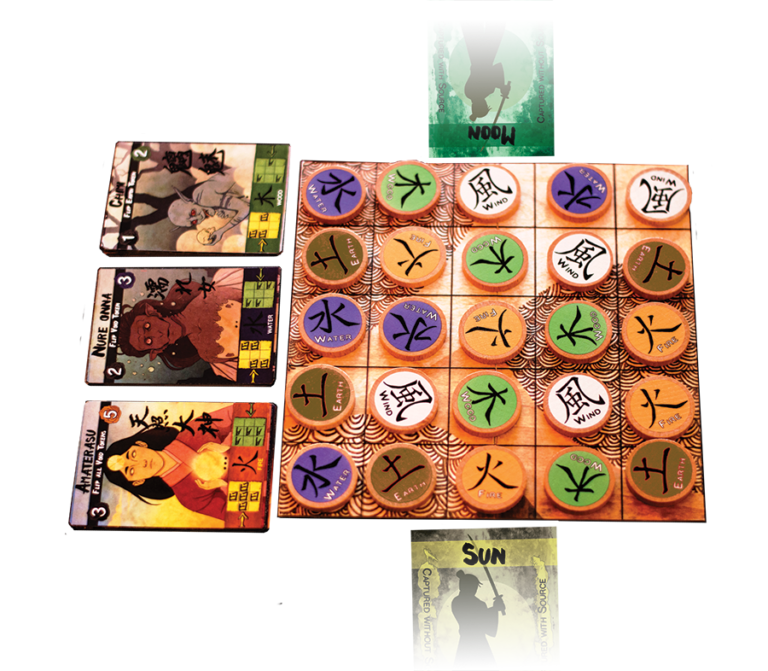 Play occurs on a 5×5 grid with players swapping one token to create a pattern of elements matching that on the available Yokai cards. More power is gained with matches in the source element. After capture, there is a release of magical energy and the field of battle will change as a result. Voids are created, wild magic appears, or the universe could shift.