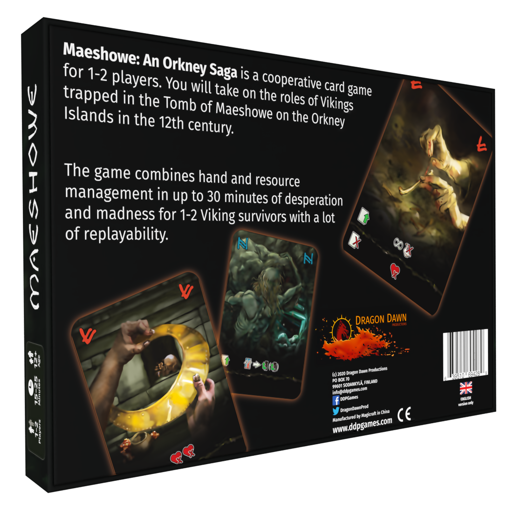 Maeshowe: An Orkney Saga is a cooperative card game for 1-2 players. You will take on the roles of Vikings trapped in the Tomb of Maeshowe on the Orkney Islands in the 12th century.