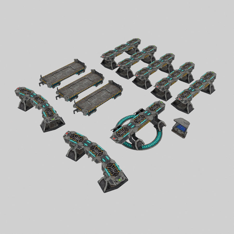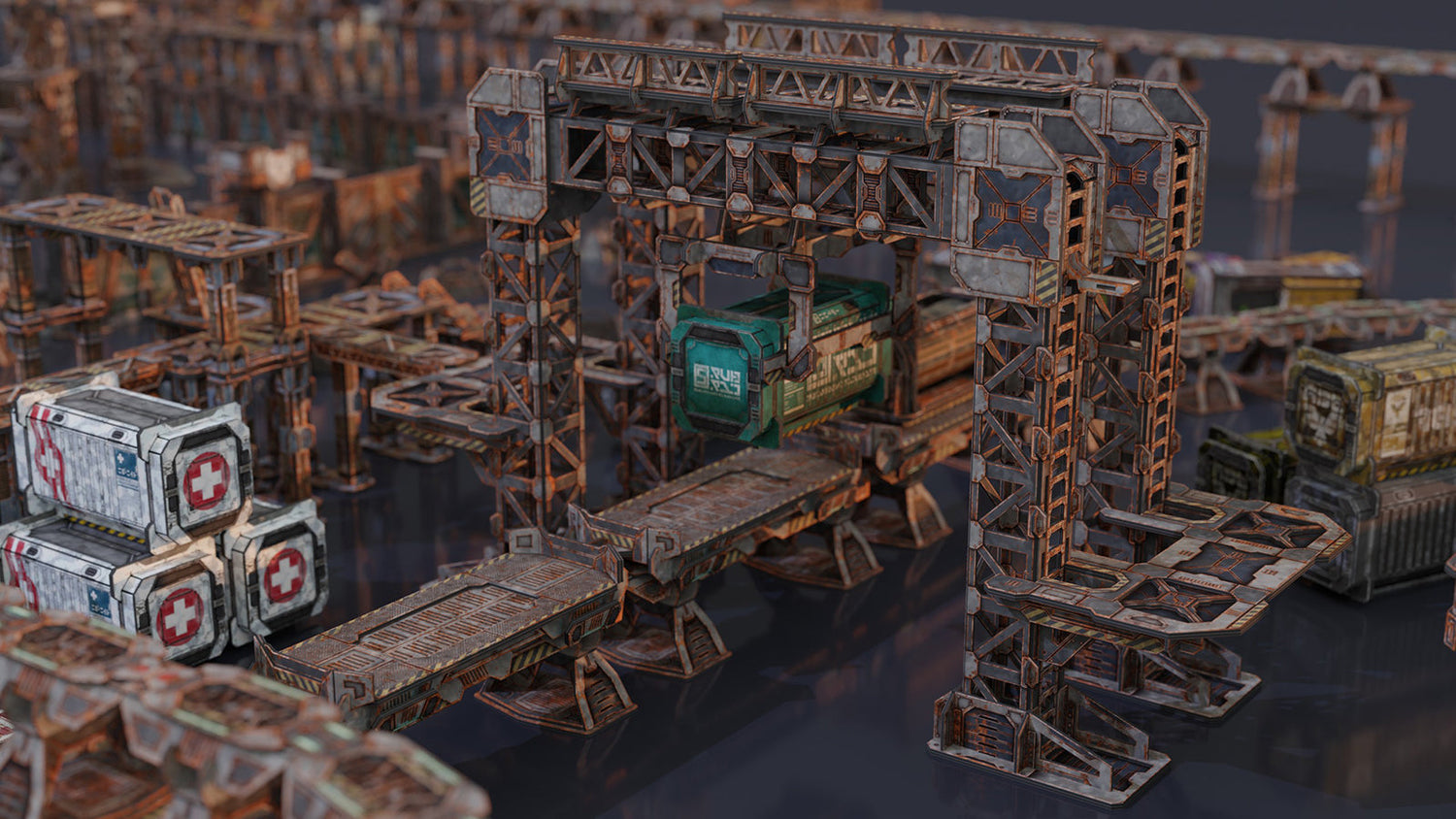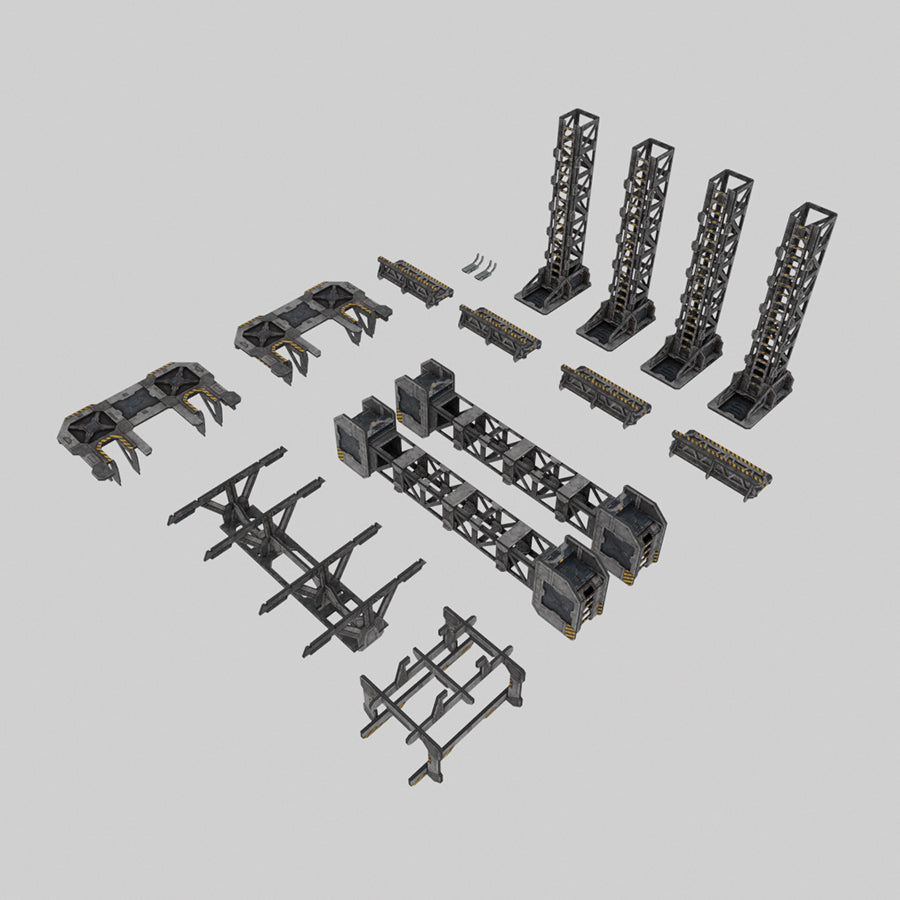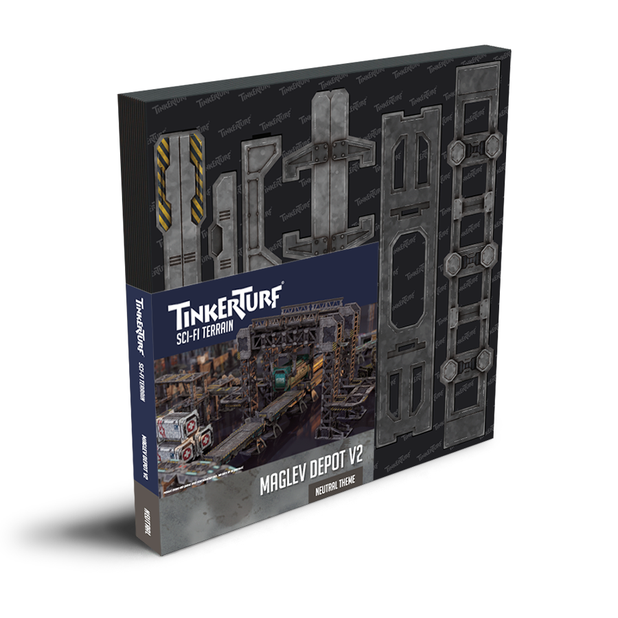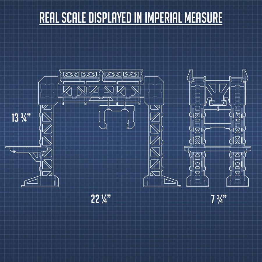 Tall and forboding, the massive MagLev Depot V2 puts dramatic purpose to the industrial battlescape. The imposing structure is topped by a railed catwalk, reachable by any of four perimeter ladders integrated into the support pillars. Included ladder stands allow figures to be perched anywhere along the ascent. Underneath the span is a crane that can be moved side-to-side, sized to fit the Containers from our other sets. Two large platforms attach at either end of the structure or double-stack on one side and match the standardized heights of TinkerTurf platforms. The platforms can be re-positioned between battles (or even during a battle for dramatic effect). This is a champion-grade centerpiece of a military-industrial battlefield sure to create lasting memories of sci-fi combat.