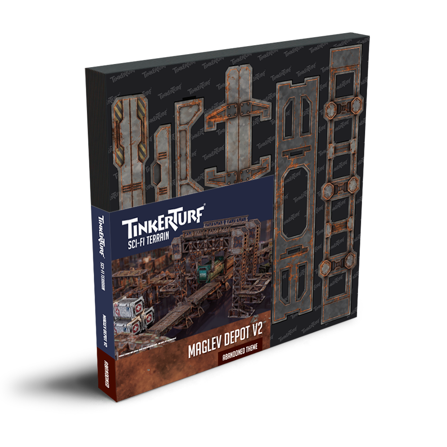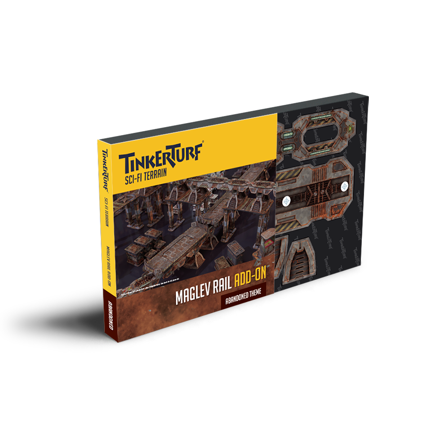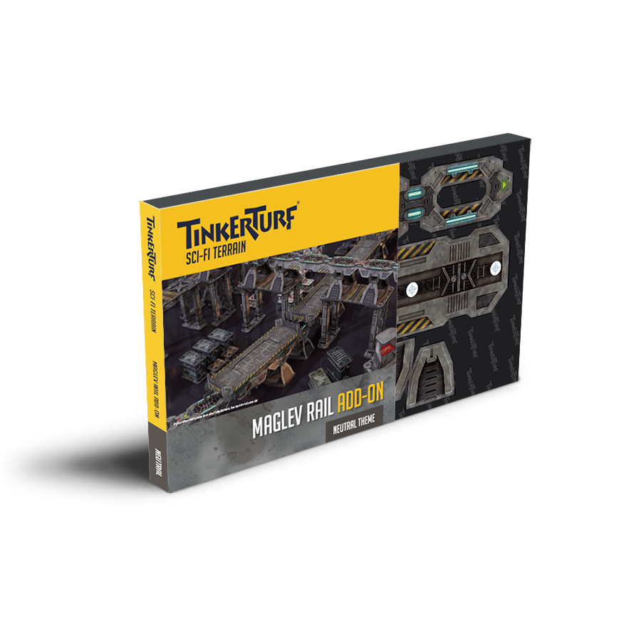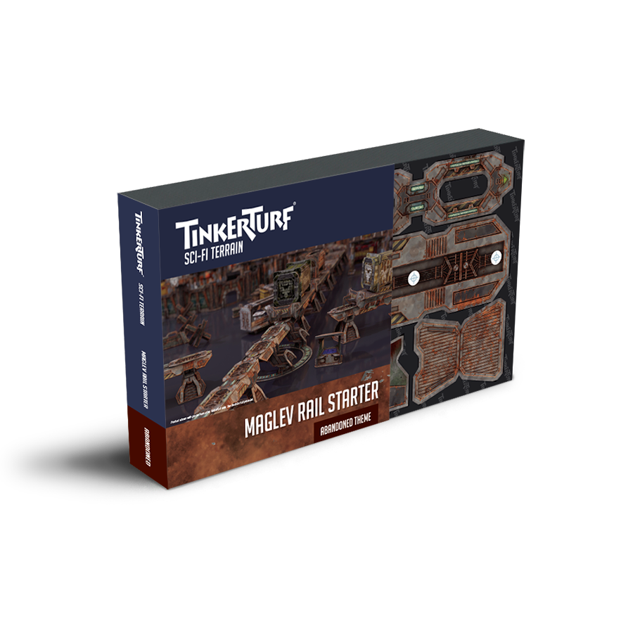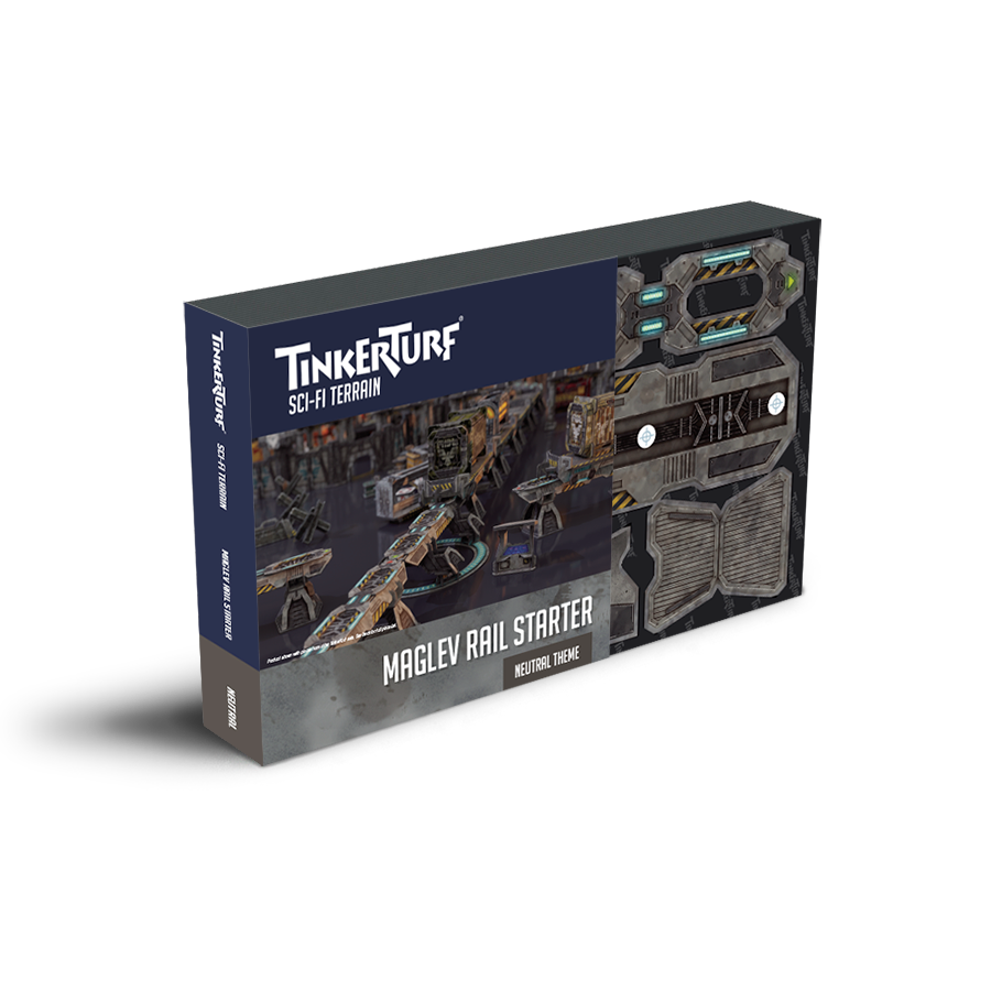 Get that adventure a-going with the MagLev Rail Starter, featuring two cargo cars (sized to fit TinkerTurf containers, or serve as mobile gunnery stations), over 50 inches of elevated MagLev rail, and a dynamic Rail Switch that can be rotated to connect different MagLev rail lines. Oh! And a little control booth with a flippable panel that you can position alongside the switch, or as a lonely ops station elsewhere on your battlefield.