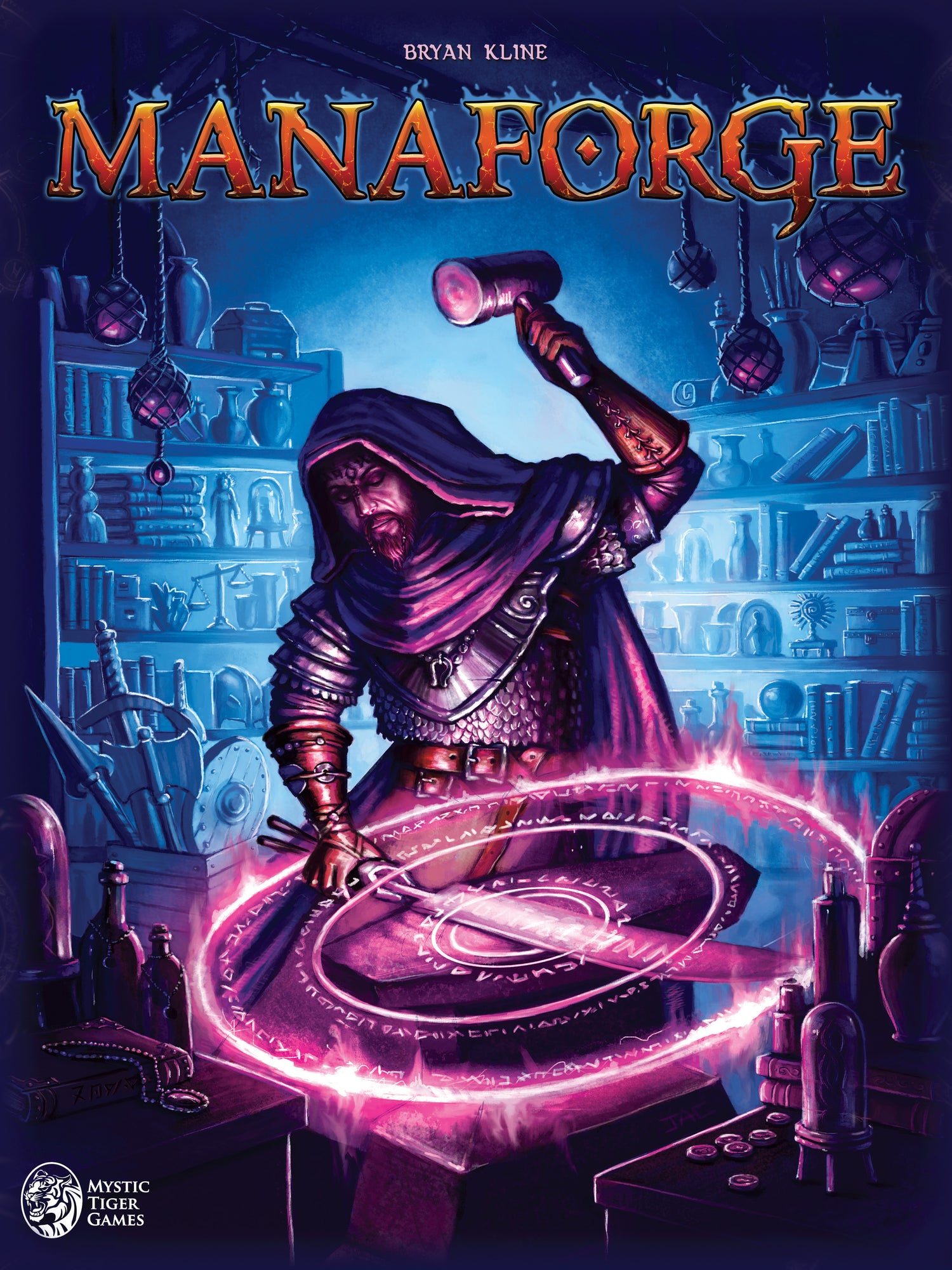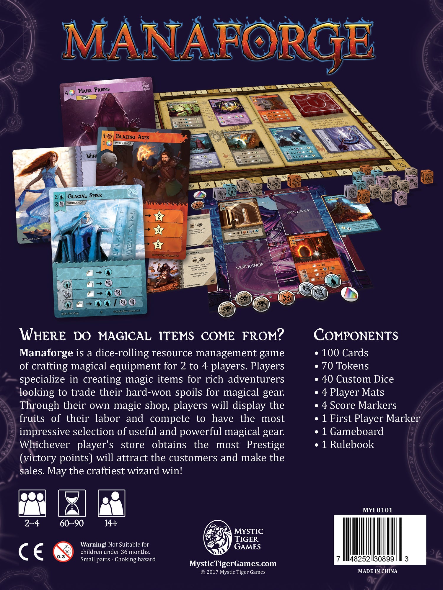 Manaforge is a dice-rolling resource management game of crafting magical equipment for 2 to 4 players. Each player plays a wizard that specializes in creating magic items. These wizards cater to rich adventurers looking to trade their hard-won spoils for magical gear to make themselves more powerful. Each wizard owns a magic shop in which they display the fruits of their labor for gold-laden adventurers to come in and purchase. However, the adventurers' funds are finite. The wizards are competing to make their shops the most famous so that the adventurers will stop there first. And the best way to make a shop famous is to have the most impressive selection of useful and powerful magical gear. Whichever player's store obtains the most Prestige (victory points) will attract the customers and make the sales. May the craftiest wizard win!