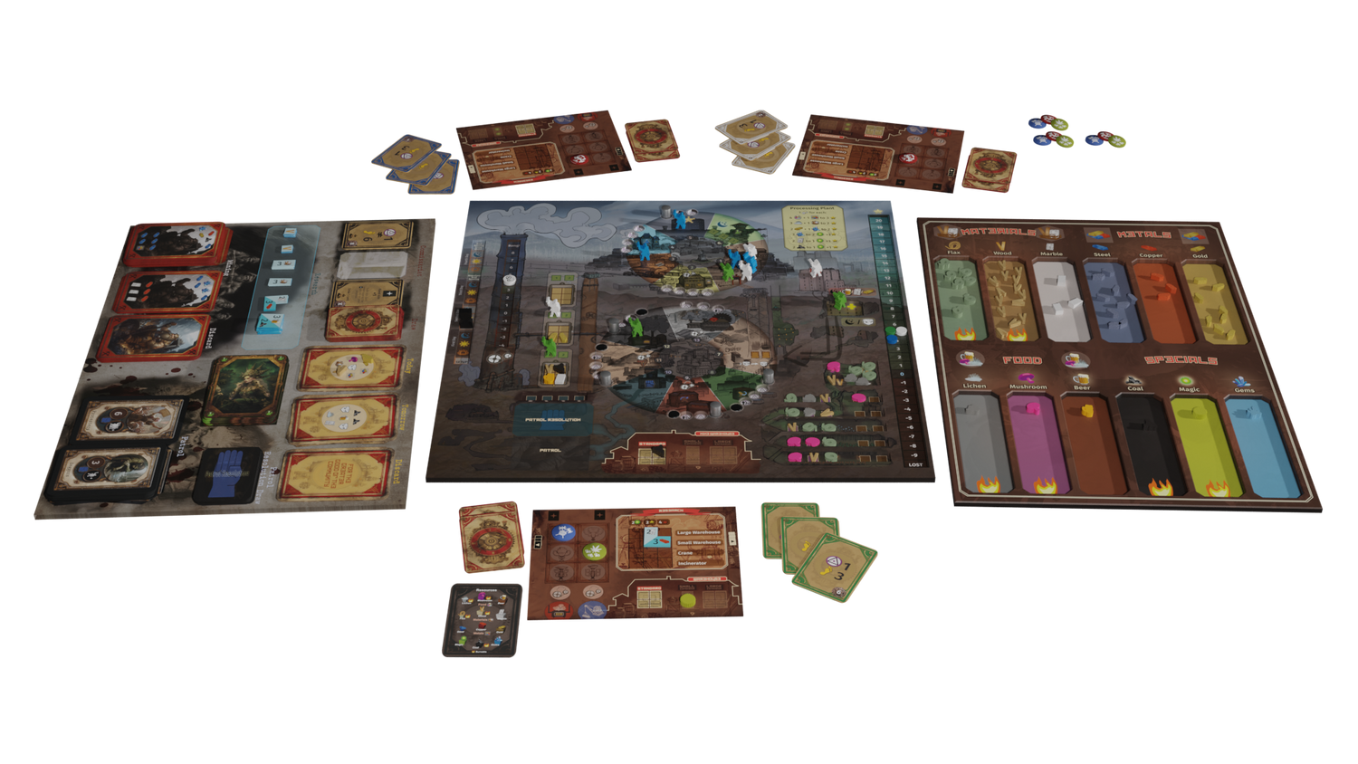 Mine 77 gameplay revolves around two connected rondels - an underground production rondel and an above-ground ‘town’ rondel. The game utilizes a simultaneous action selection process using work-order cards. There is an incentive to cooperate and interact with your fellow Overseers, as every second round, the Government will check that Overseers collectively have completed the set goal - and, if need be, collectively punish slackers. A sneaky Overseer may opt to evade the collective punishment by gathering rosettes (tokens of communal esteem).
