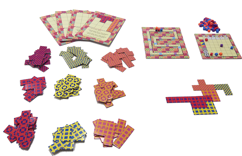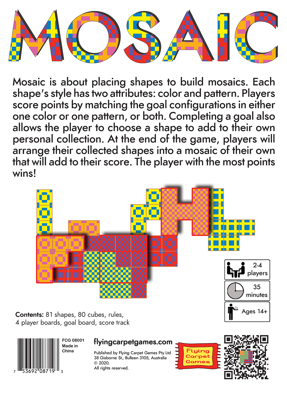 Mosaic is about placing shapes to build mosaics. Each shape's style has two attributes: color and pattern. Players score points by matching the goal configurations in either one color or one pattern, or both. Completing a goal also allows the player to choose a shape to add to their own personal collection. At the end of the game, players will arrange their collected shapes into a mosaic of their own that will add to their score. The player with the most points wins!