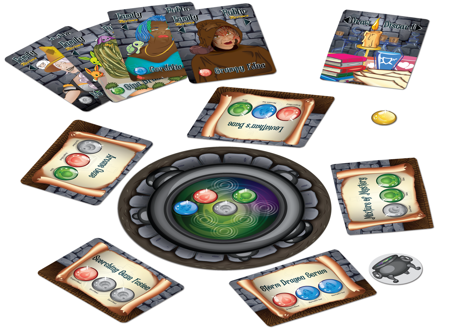 Take on the role of one of four witches competing in the annual potion brewing contest! The winner receives a 50% off coupon for Hansel's Housing Goods and the keys to a gently used houseboat. The twist? All competitors must share a single cauldron, making every move critical. A poorly placed ingredient could allow your opponents finish their potions first and take the lead. You must plan carefully, block your rivals, and outmaneuver the competition to win in this dynamic, engaging, and quick competitive board game! Players take turns pulling a random ingredient from a bag and placing it on an empty location of a three by three grid (the cauldron). After placing the ingredient, the player can complete a potion by matching an exact color pattern to a recipe card that they have in their hand or displayed around the cauldron. If they don't see a match, they may draw a card and then discard a card to search for a more suitable recipe. The first player to complete a number of potions based on the number of players wins.