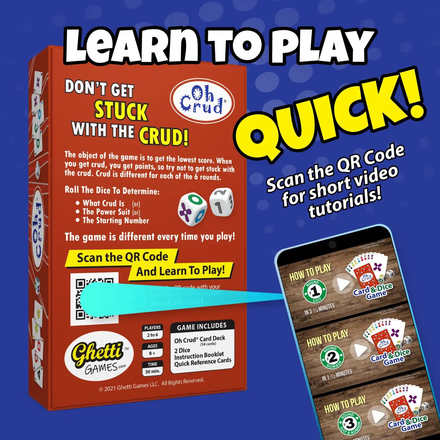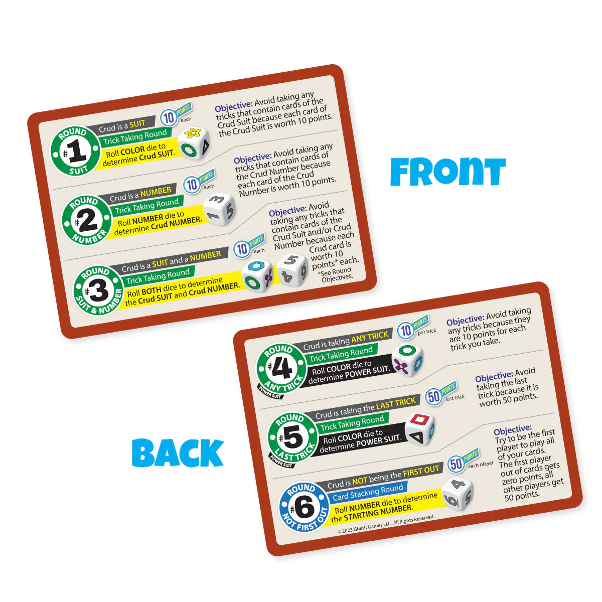 Oh Crud™ is the fun and exciting new card game that's like 6 games in 1. There are 6 rounds of game play and each round is played slightly different because Crud is different for each round. Before each round, you roll the appropriate dice which can drastically affect your game play strategy.