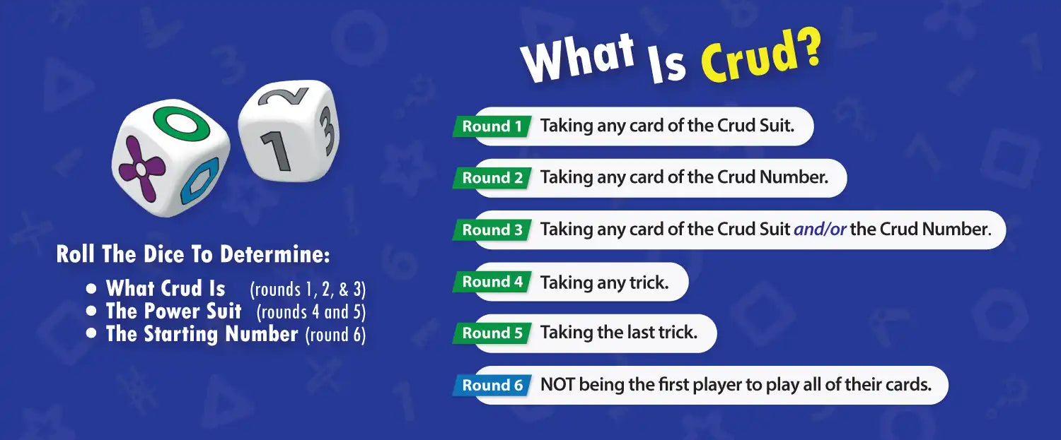 Rounds 1 through 5 are trick taking rounds and are played similarly, but each round has a different objective because Crud is different for each round.