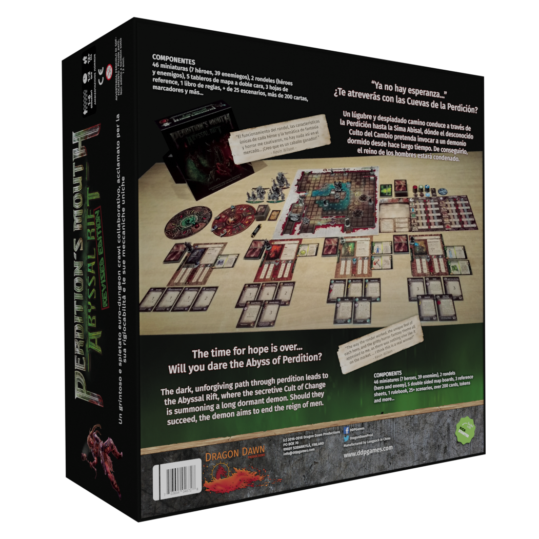 The dark, unforgiving road through Perdition leads to the Abyssal Rift, where a secretive Cult of Change is summoning a long dormant Demon. Perdition’s Mouth is a deeply immersive dungeon crawl adventure style game set within a collection of scenarios that form an extended campaign. The game has a strong role-play feel to it but each adventure requires no dungeon master due to the automated non-player character action Rondel. Designed as a fully cooperative game, Perdition’s mouth accommodates from one to six players taking on the role of brave heroes delving ever deeper into the Abyssal Rift to thwart the threat posed to humanity. With its strong emphasis on player cooperation, this is a fast and brutal environment in which the heroes will see their multifaceted skills and talents tested to the very limits.