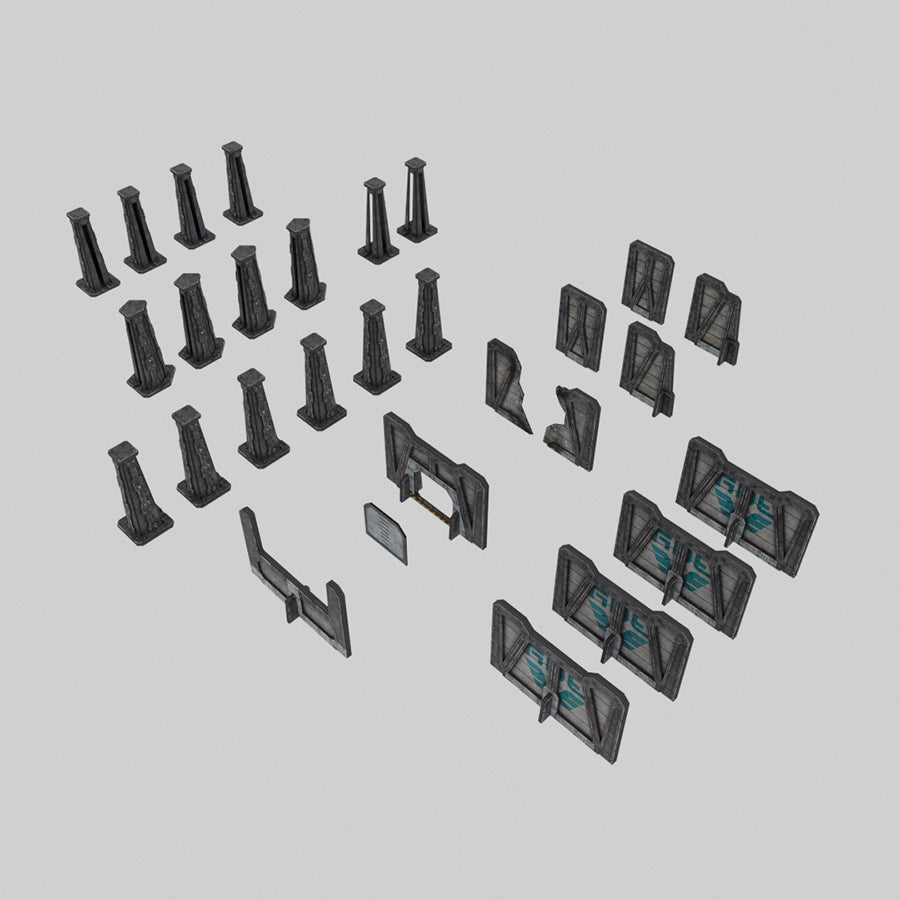 • 4 Walls • 1 MagLev Wall • 1 Personnel Door Wall • 1 Destroyed Wall • 2 End Walls • 2 Half Walls • 6 Straight Stanchions • 4 90° Stanchions • 4 60° Stanchions • 2 “T” Stanchions