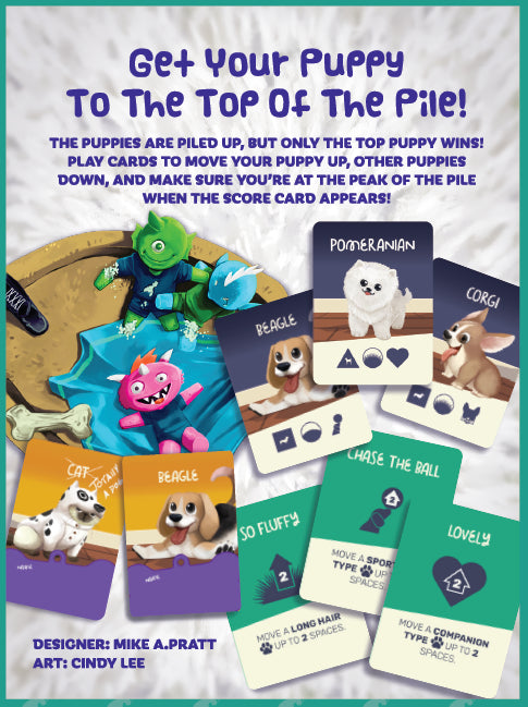Each player has a secret puppy. Over the course of the game, players will move various puppies up and down through the pile. Try to figure out your opponent's puppies and keep them lower in the pile while you try to move your secret puppy to the top.