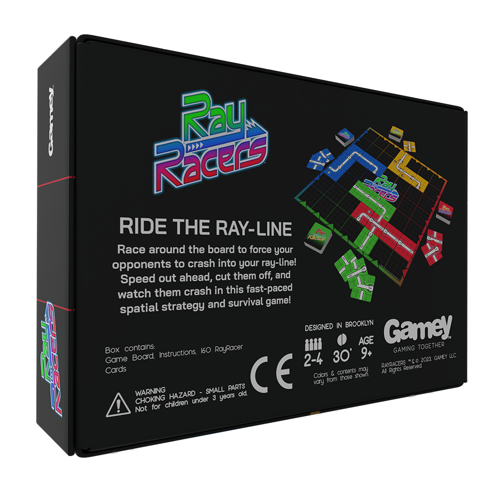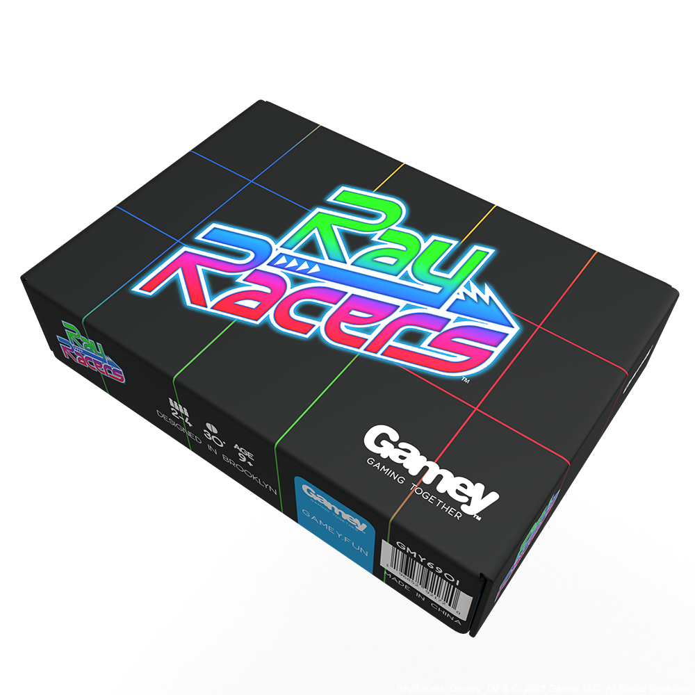 Setting up a game of RayRacers is easy! Place the game board on the play area, give each player a color deck to play, then search for a Breakthru card and set it aside. All that is left is to shuffle decks and start! A round of RayRacers is fast! Even if a player crashes in a round they are back to playing in a minute! The last player left in the round scores a point. The first player to score two points wins the game!