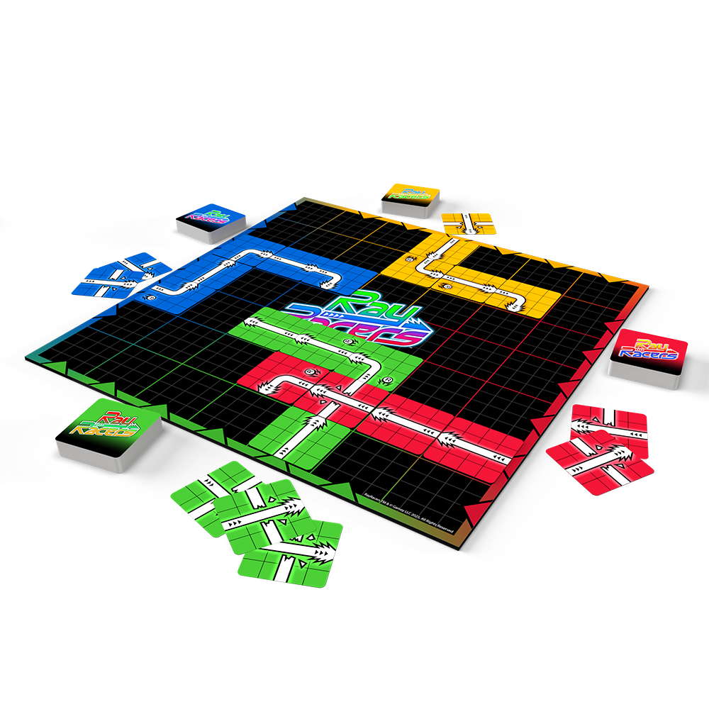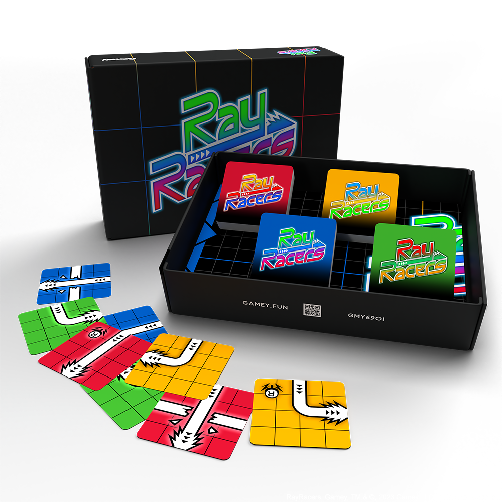 RayRacers is a fast-paced spatial strategy and survival game for 2-4 players. Players simultaneously place their cards on a game grid to create ray-lines, moving across the grid and making obstacles for their opponents to crash into. The last surviving player wins!