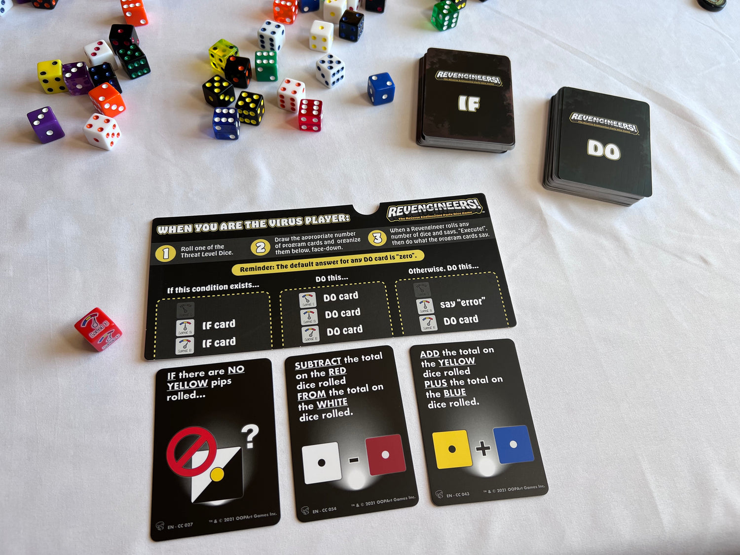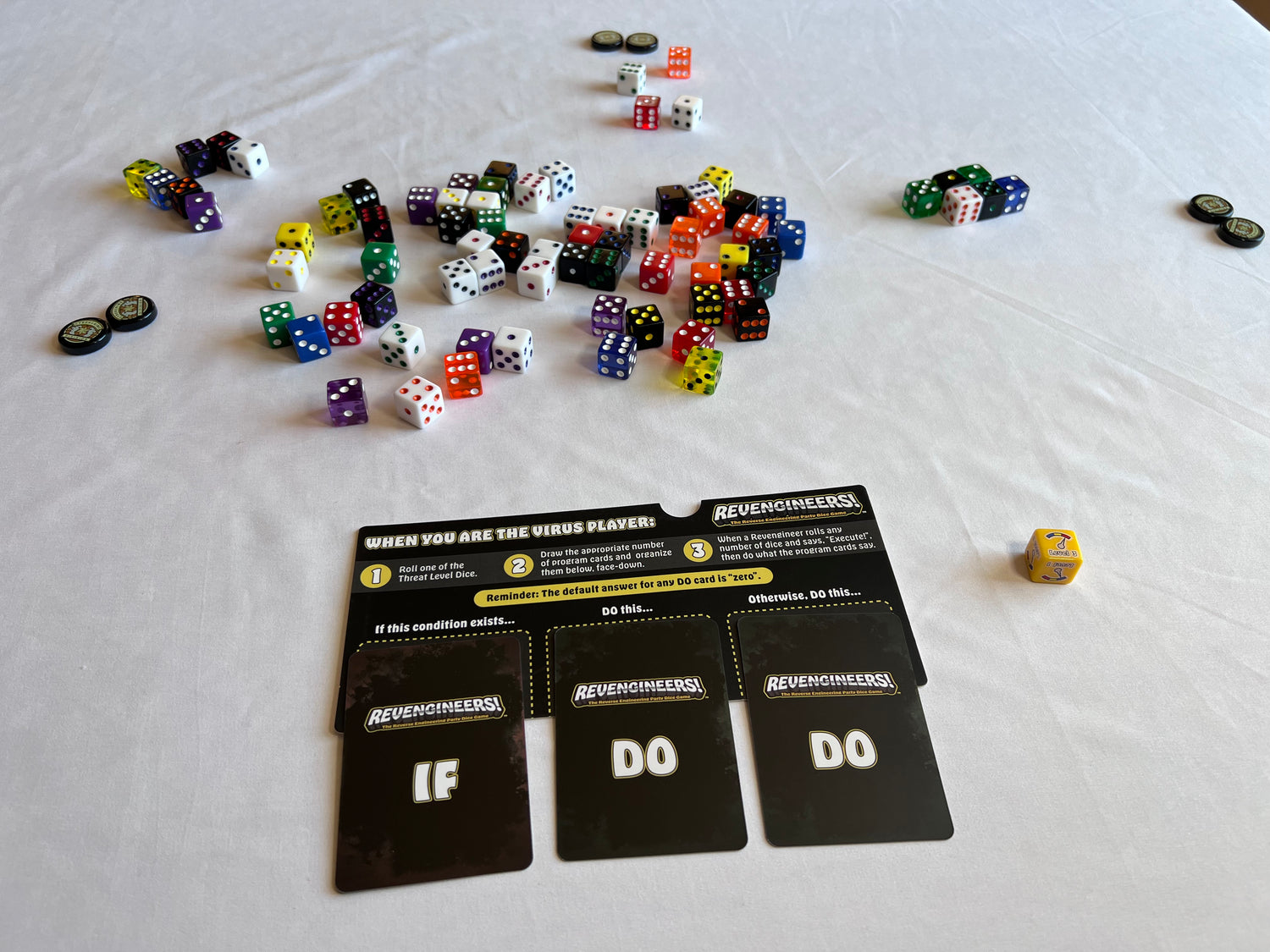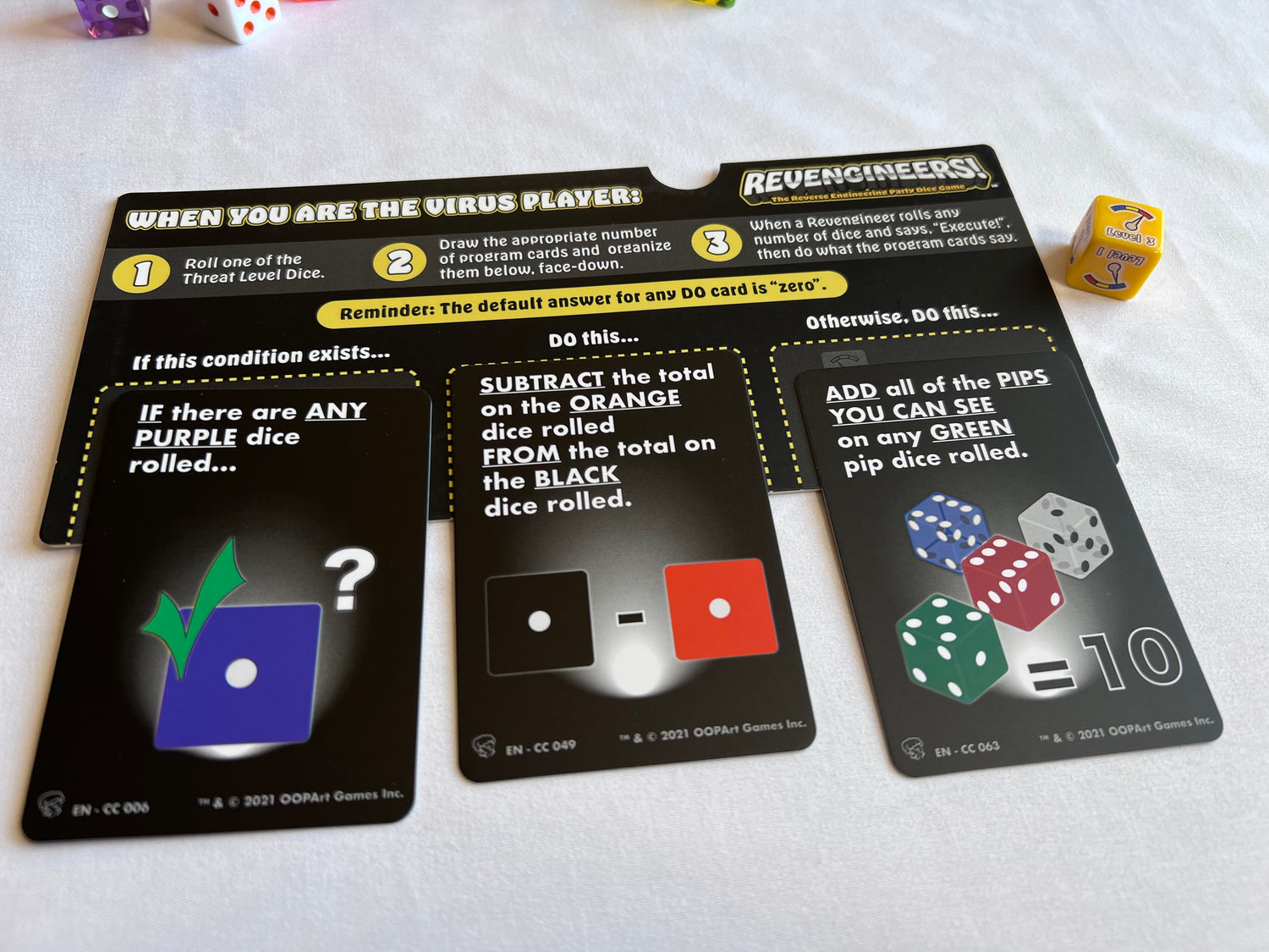Each player takes it in turn to become a “virus”, and draws 1 to 3 Program Cards. The other players use dice rolls as inputs for that virus program. The Virus Player looks at the dice rolled, and speaks the output, as described by their Program Cards. This continues until one of the Revengineers successfully determines what the Program Cards say.