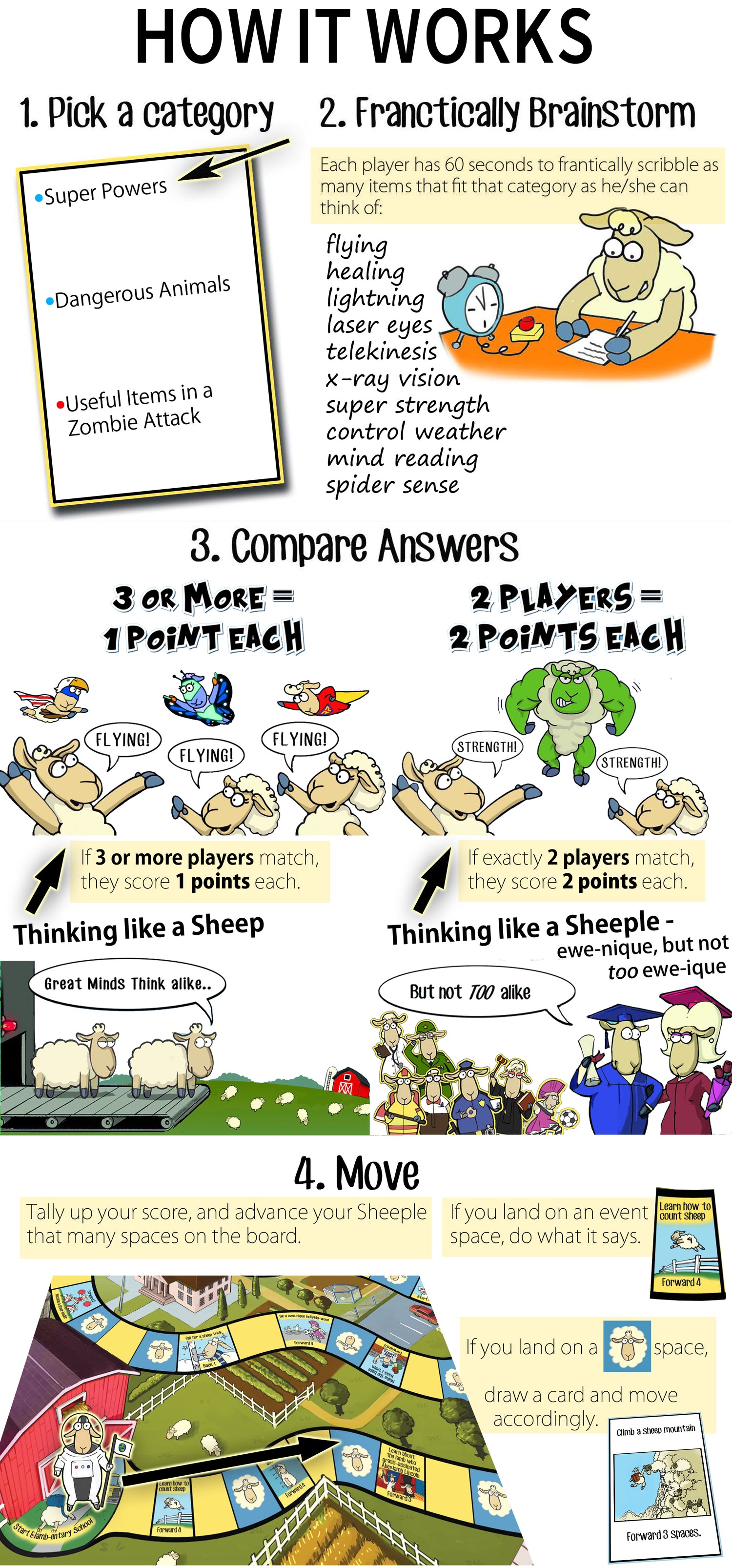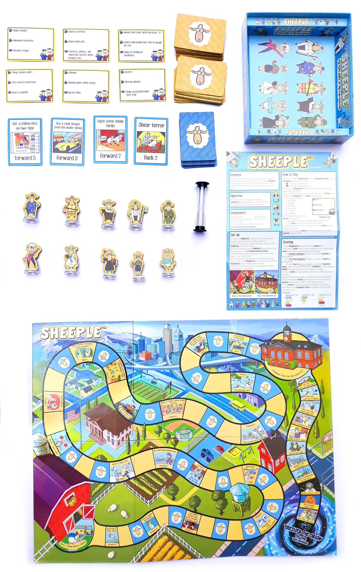 - EASY TO LEARN, FUN TO PLAY | 2 minutes to learn, 30 minutes to play, a lifetime of fun! Game Includes 1 Beautiful Game Board, 116 Category Cards (348 Categories), 46 Pun Event Cards, 10 SHEEPLE Character Game Pieces, 1 Sand Timer, 1 Rule Sheet.
