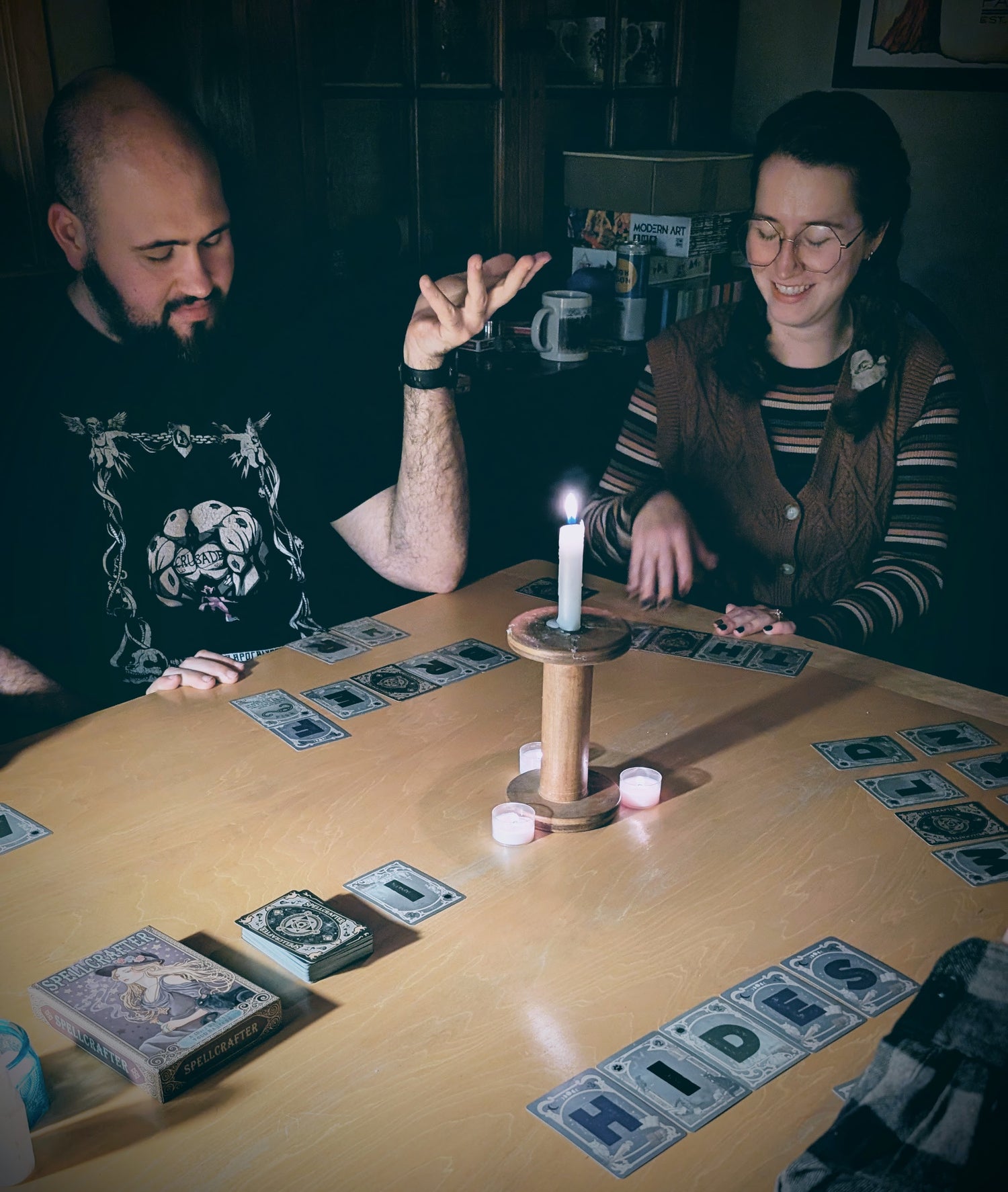 Each letter card is assigned a suit (Familiars, Sigils, Cauldrons, and Moons) along with a numeric value (similar to Scrabble). Bonus points are awarded for long words, words in the same suit, or both! Special cards allow you to change the suit, duplicate letters, or add a wildcard letter.