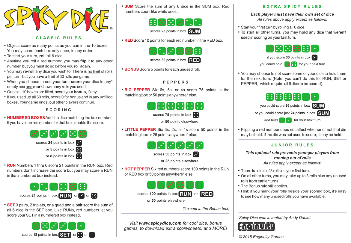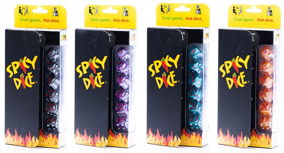 All 6 dice are different! Each has one face with red spots. Includes Classic & Extra Spicy rules, plus Junior rules for younger players.
