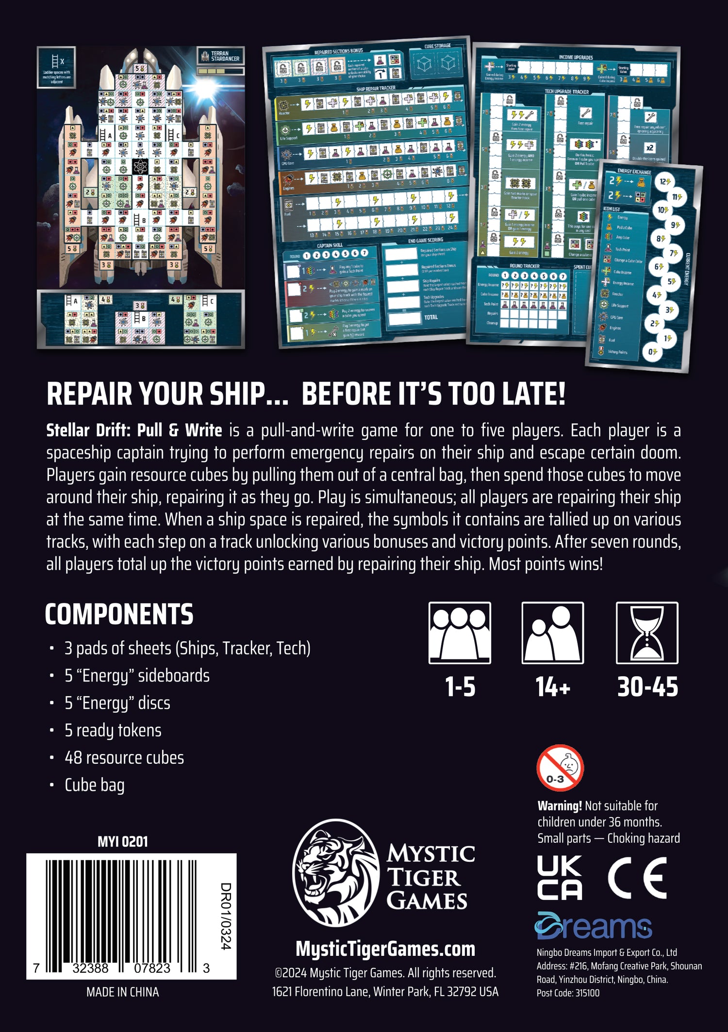 Stellar Drift: Pull & Write is a pull-and-write game about repairing your broken spaceship. Each player is the captain of their own heavily damaged ship, drifting in orbit around an unstable white dwarf star. The captains must quickly conduct emergency repairs to their ships using whatever materials they can find, before the star decides to go nova and wipe them all out.