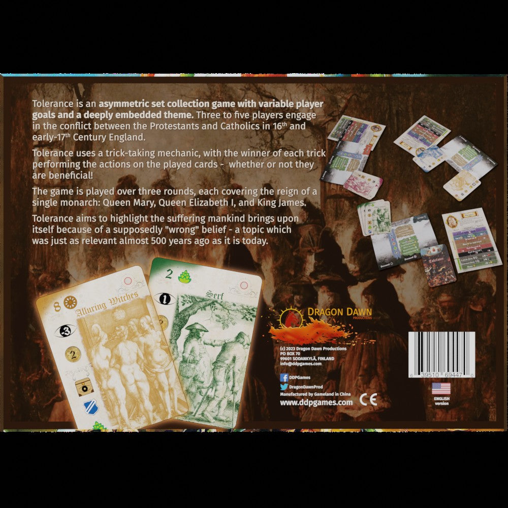 Tolerance is an asymmetric set collection game with variable player goals, set in 16th and early 17th century Reformation England. Players engage in the conflict between the Catholics and the Protestants. Although Tolerance uses a trick-taking mechanic, winning the trick is not the main goal since all players will have influenced the outcome when the actions on the played cards are resolved. Not always with the most beneficial results!