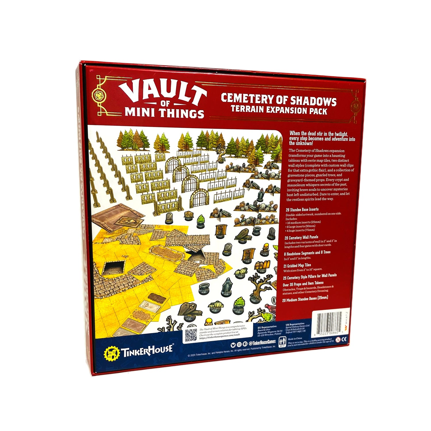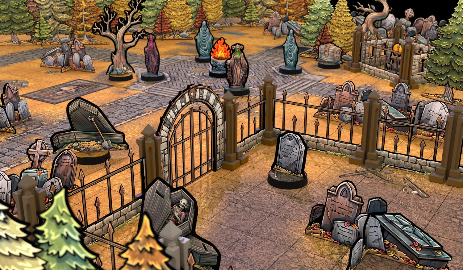Over 35 Props and Item Tokens, Obstacles, Traps & hazards, Headstones & statues, and other Cemetery Dressing.