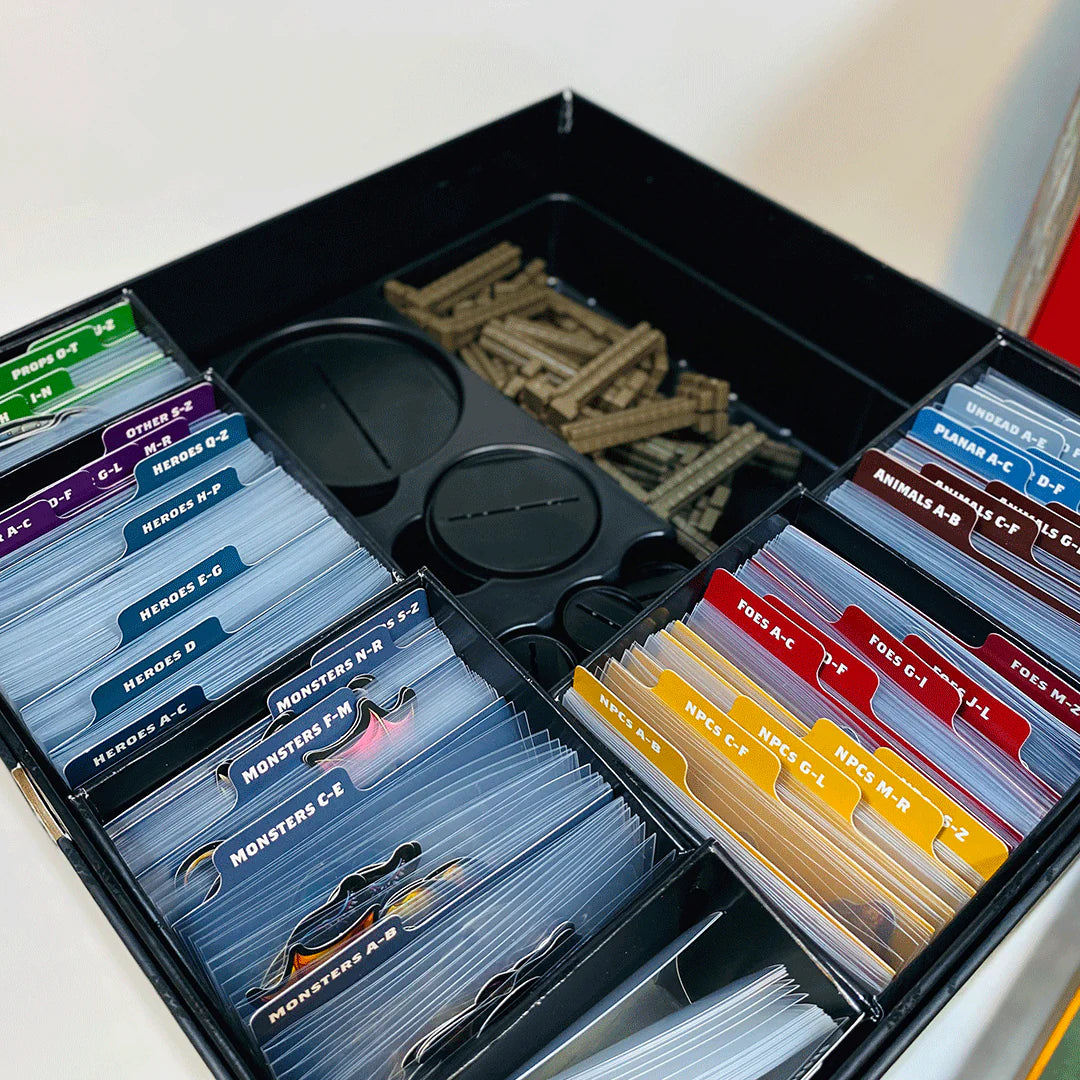 Stay organized effortlessly with nested storage trays tailored for each terrain type, complete with separate compartments for huge standees, wall panels, and map tiles. The unique card catalog system with easy-access, side-load sleeves ensures you can quickly find and deploy exactly what your game session demands.