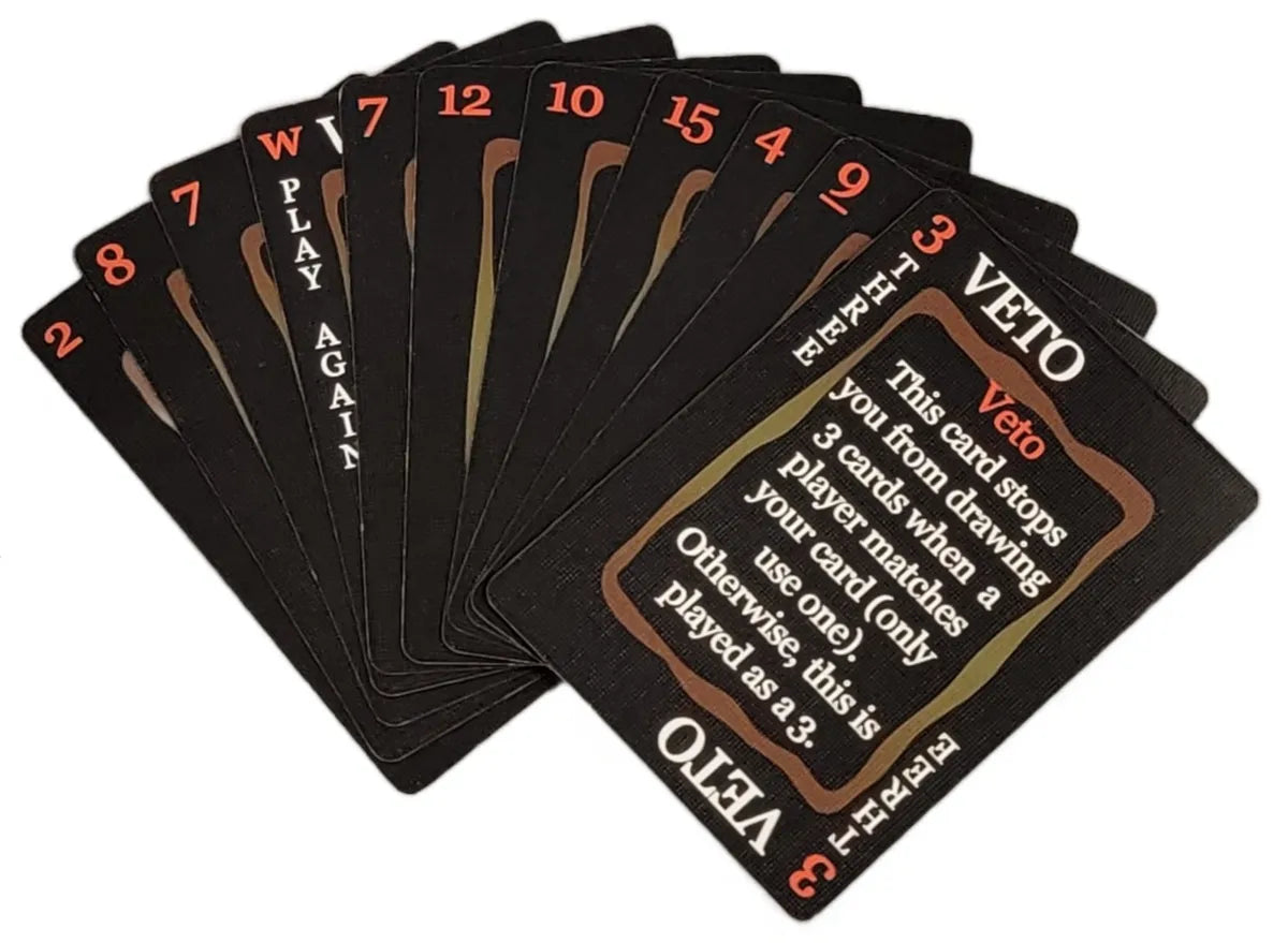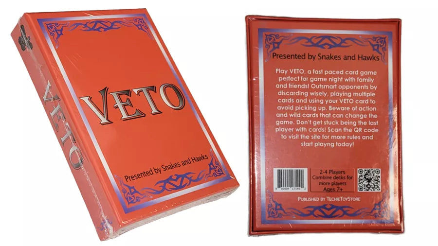 VETO is an easy shedding-type card game spiced up with special functions of certain cards. Players try to get rid of all their cards first, stacking equal or higher-ranking ones on each other, unless the special card has been played to make lower cards win! Play a VETO card to stop from having to pick up cards when a player plays a duplicate card. Don't be the last one with cards left at the end!