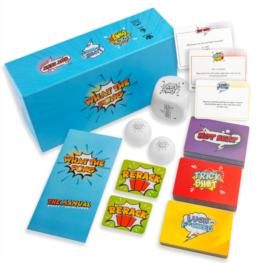 WHAT THE PONG is what you get when you combine the classic game of pong with trivia, luck, and trick shots!!! Its time to elevate your game night with this fun party pong game!